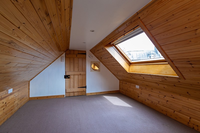This attic bedroom has pine clad walls and a velux window which allow natural daylight to flood through. The floor has been carpeted and there is a 3-spot light fitting, ceiling downlighters and double sockets.