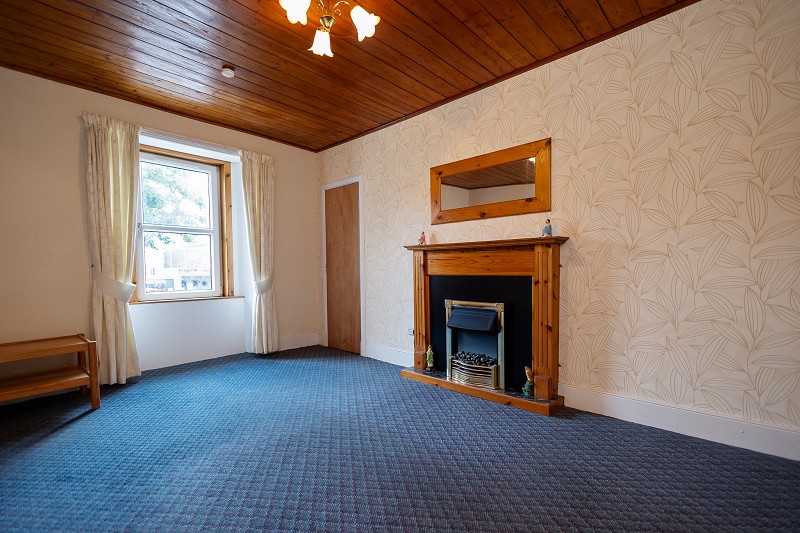 This beautiful room has a featured papered wall and as of good proportions. There is an attractive pine fireplace with an insert electric fire which makes a pleasing focal point within the room. It benefits from a fitted carpet, at triple light fitting and a Kyros heater and the ceiling is clad in pine. A window with curtains face of the front elevation. There is also a storage cupboard.