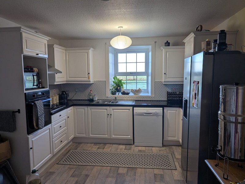 The lovely kitchen is well presented with white painted base and wall units with laminate worktops. There is a stainless-steel sink with a drainer, a four-ring gas hob, an electric oven and a stainless-steel chimney extractor. A window faces the rear elevation and vinyl is laid to the floor. There is a central heating radiator and a door leads into the family room.