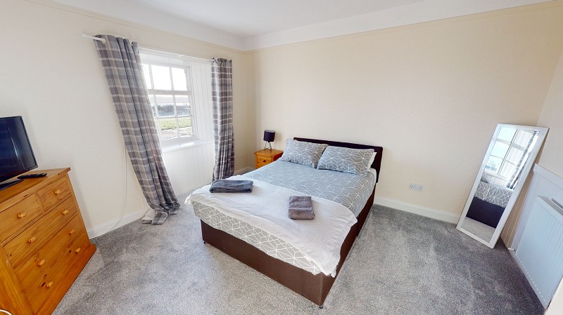 This neutrally decorated room has magnolia painted walls and features a multi-fuel stove which sits on a Caithness flagstone hearth. There are two central heating radiators and a grey carpet has been laid to the floor. This spacious room benefits from triple aspect windows which let plenty of natural daylight flood through. The lounge also enjoys an outlook towards the loch and offers panoramic views over the scenic countryside.