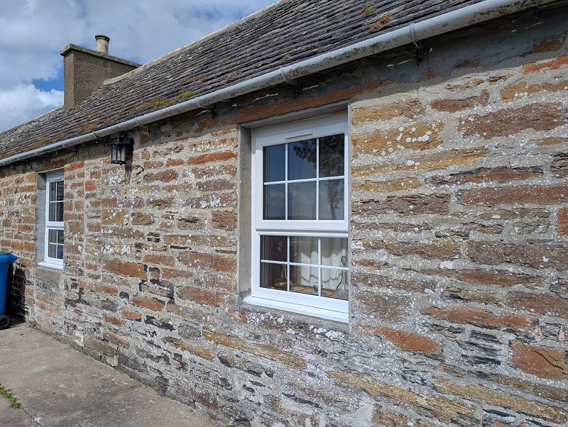 Wooden entrance doors lead into the open hallway where the floor is laid to Caithness Flagstone. There is a window to the side with a deep sill. To the right side of the open hall is a further hallway which is laid to carpet. There are four radiators and another window to the side elevation with a deep sill. This room benefits from a large storage cupboard which houses the boiler and hot water tank. Two windows face the rear elevation and there is a hatch to the attic space in the loft void.