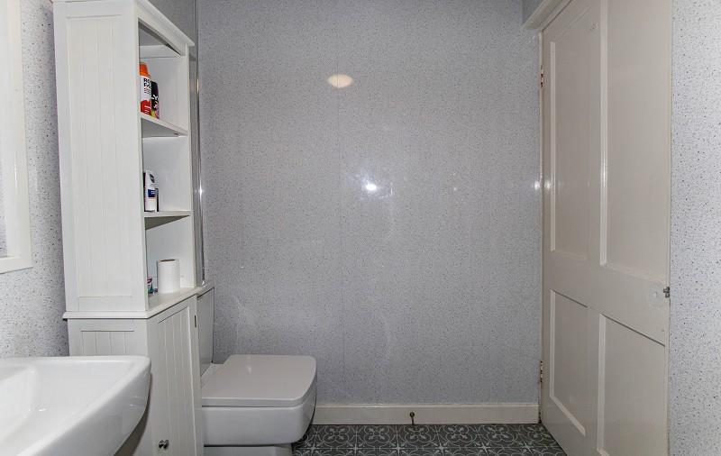 The well-presented shower room has a dado rail to the half-height as well as a velux window. Vinyl has been laid to the floor. There is a pedestal sink, a toilet and curved shower enclosure. A hatch gives access to the loft void; there is a pendant light fitting and a wall mounted cupboard.