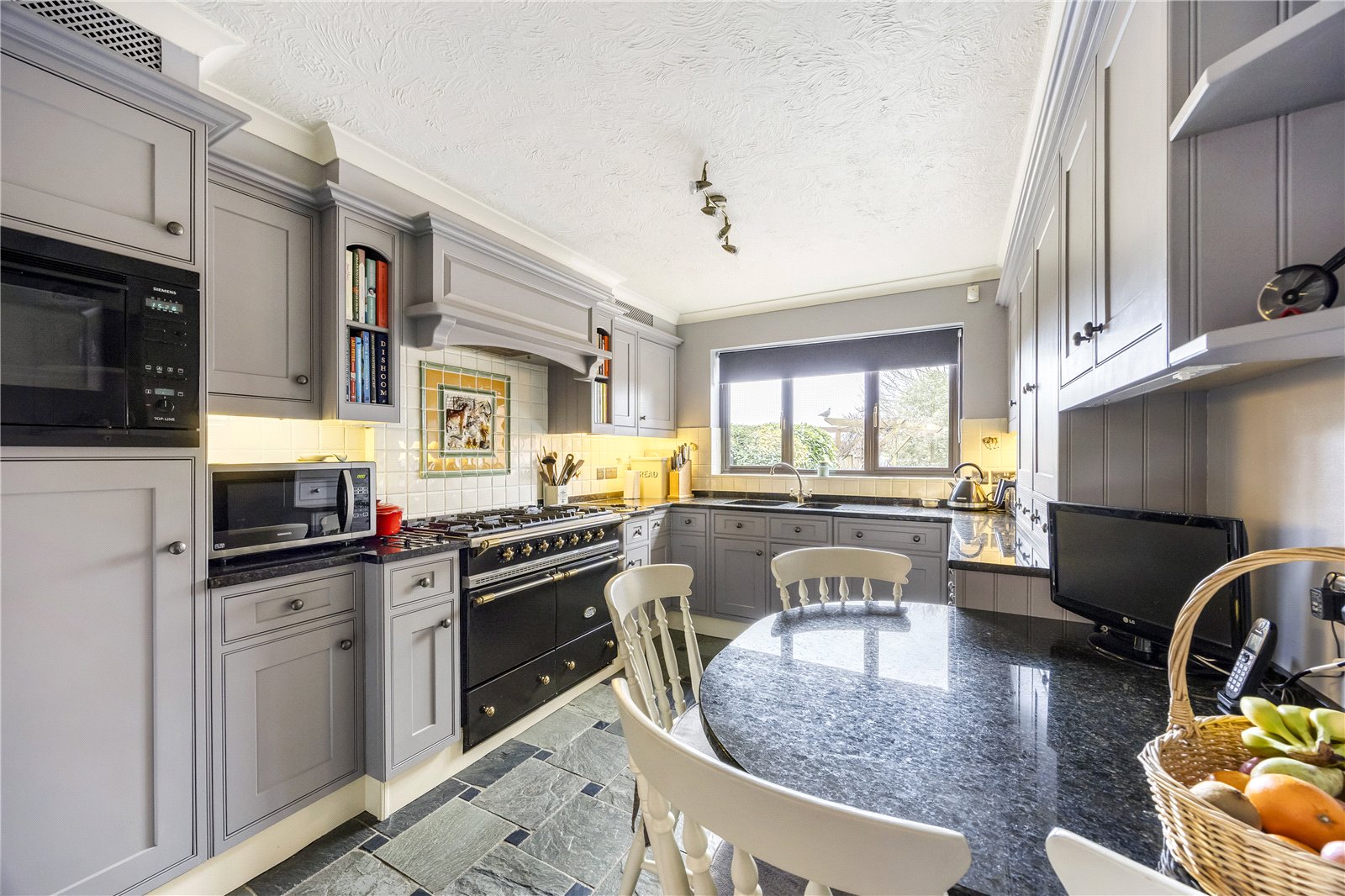 Upon entering the property, you are welcomed by a spacious entrance hall, with doors leading to all ground-floor rooms and a staircase rising to the first floor, with a useful cupboard beneath. The principal sitting room is particularly impressive, measuring an excellent 25’10”, and benefits from dual-aspect windows, as well as an attractive exposed brick fireplace with an inset gas living-flame fire. The second reception room is also generously sized at 17’10” and is currently used as a dining and sitting room. This room features patio doors that open directly onto the rear garden, providing an ideal space for entertaining and family living. The kitchen/breakfast room is fitted with a range of wall and base units complemented by granite worktops and a breakfast bar. It also features a range-style cooker with a five-ring gas hob and opens into a practical utility area.