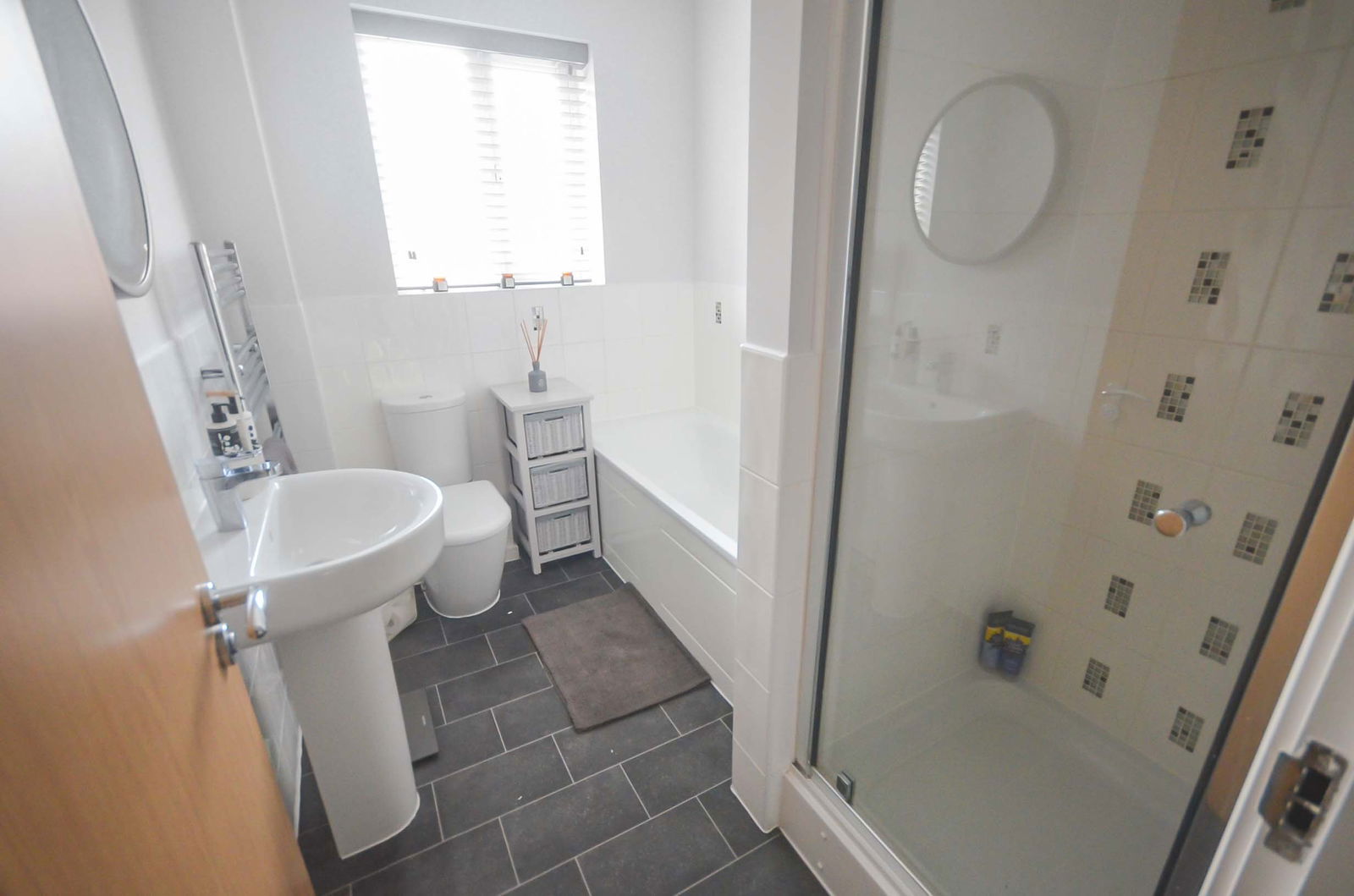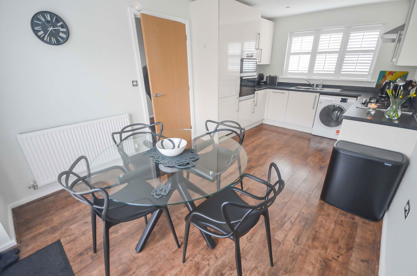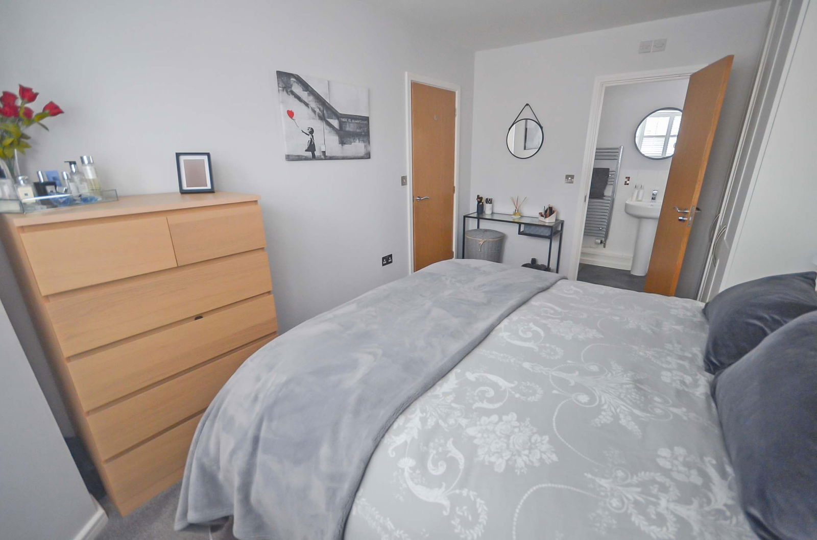 Ascending to the first floor, a bright landing leads to three well-proportioned bedrooms. The master bedroom benefits from modern fitted wardrobes and a stylish en-suite shower room, offering a private retreat. A contemporary family bathroom serves the remaining bedrooms.