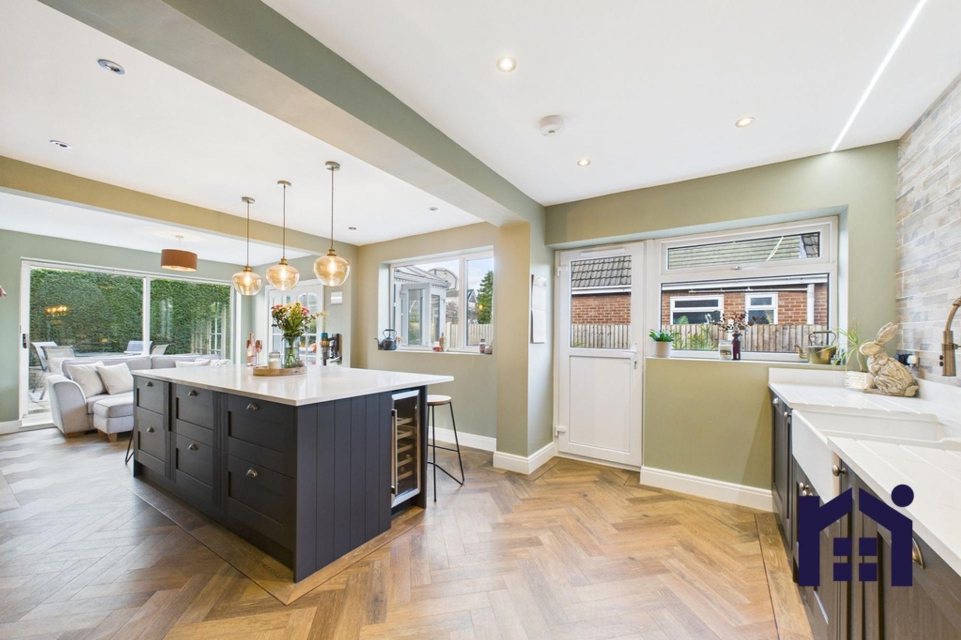 The property features four generous double bedrooms, providing ample space for family life or guest accommodation. A welcoming entrance hallway with Amtico flooring sets the tone for the home’s elegant interior, leading through to a superb open-plan dining kitchen— the true heart of the home.