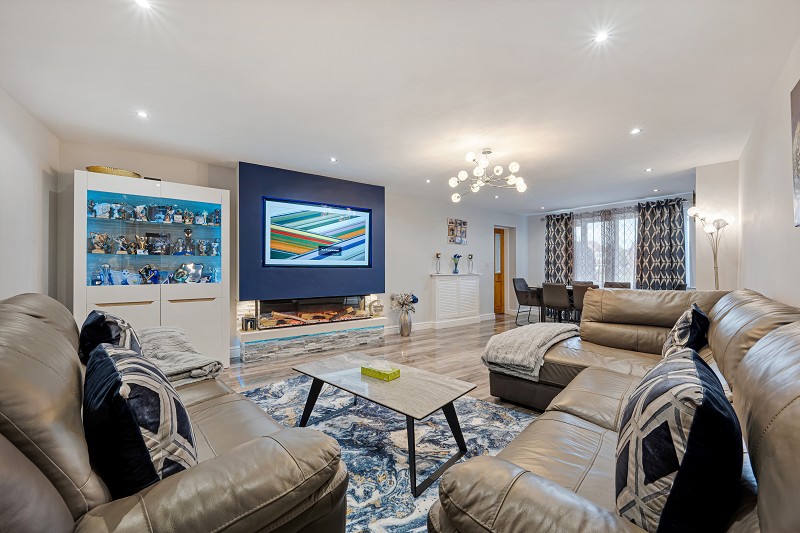 Internally, the ground floor offers a well-balanced layout designed for both functionality and comfort. A large open-plan lounge and dining area provides a central hub for family life and social occasions, while a separate reception room offers an additional, more private retreat. The modern kitchen is fitted with a range of integrated appliances, including an induction hob, double oven, dishwasher, and washing machine, and flows seamlessly into a light-filled conservatory overlooking the rear garden. Completing the ground floor is a guest W.C. and a multi-purpose room that could serve as a fifth bedroom, home office, or study, depending on requirements.