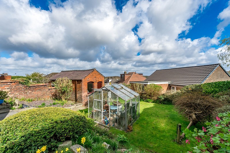 Stepping outside, the rear garden is a true highlight of the property. This stunning outdoor space features a raised patio area that's perfect for outdoor seating, surrounded by lush shrub boundaries that ensure privacy and a touch of nature. A greenhouse offers the perfect opportunity for gardening enthusiasts to cultivate their green thumb, while a small outbuilding provides additional storage or potential for use as a garden workshop.