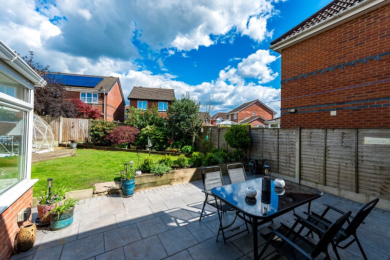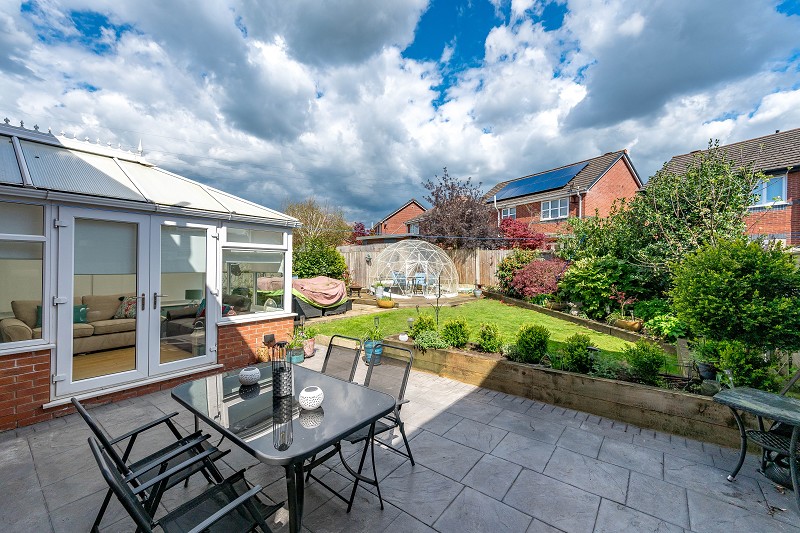 Outside, the property features a private rear garden with a well-maintained lawn and paved seating area, providing a tranquil setting for relaxation or entertaining.