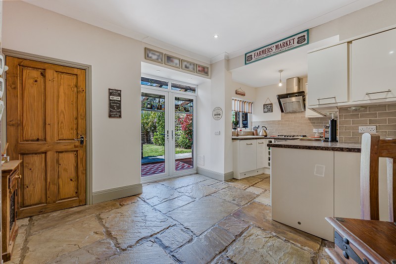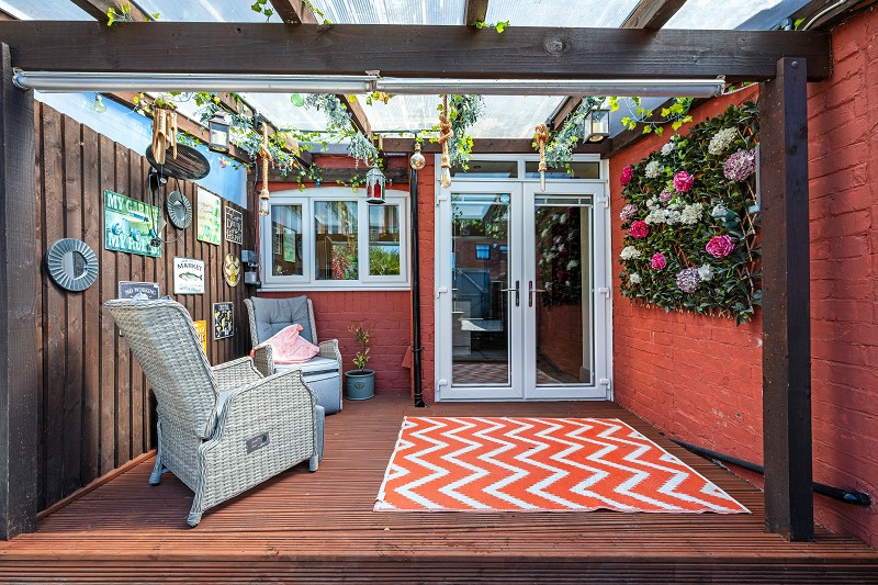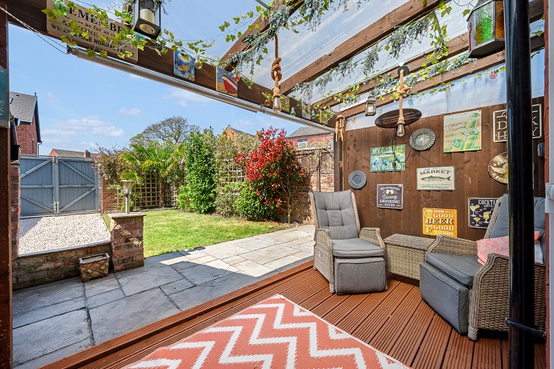 Patio doors from the kitchen lead out to the private, beautifully presented rear garden, featuring a covered patio area that offers the perfect spot for outdoor dining and relaxation.