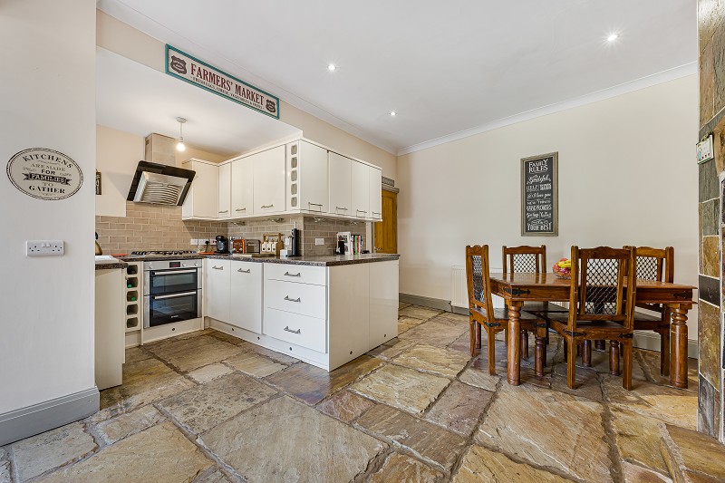 The ground floor begins with a traditional vestibule leading to a welcoming entrance hallway that leads down to a separate downstairs WC/cloak, and to the left of the hallway is a cosy snug lounge. The open plan dining/kitchen is quite unique encompassing a traditional brick built feature surround with log burner stove perfect for those winter evenings. The flooring is laid with Indian stone giving the room a traditional rustic feel to it. The kitchen has ample work surface space, built-in oven and hob and ceramic bowl sink.
