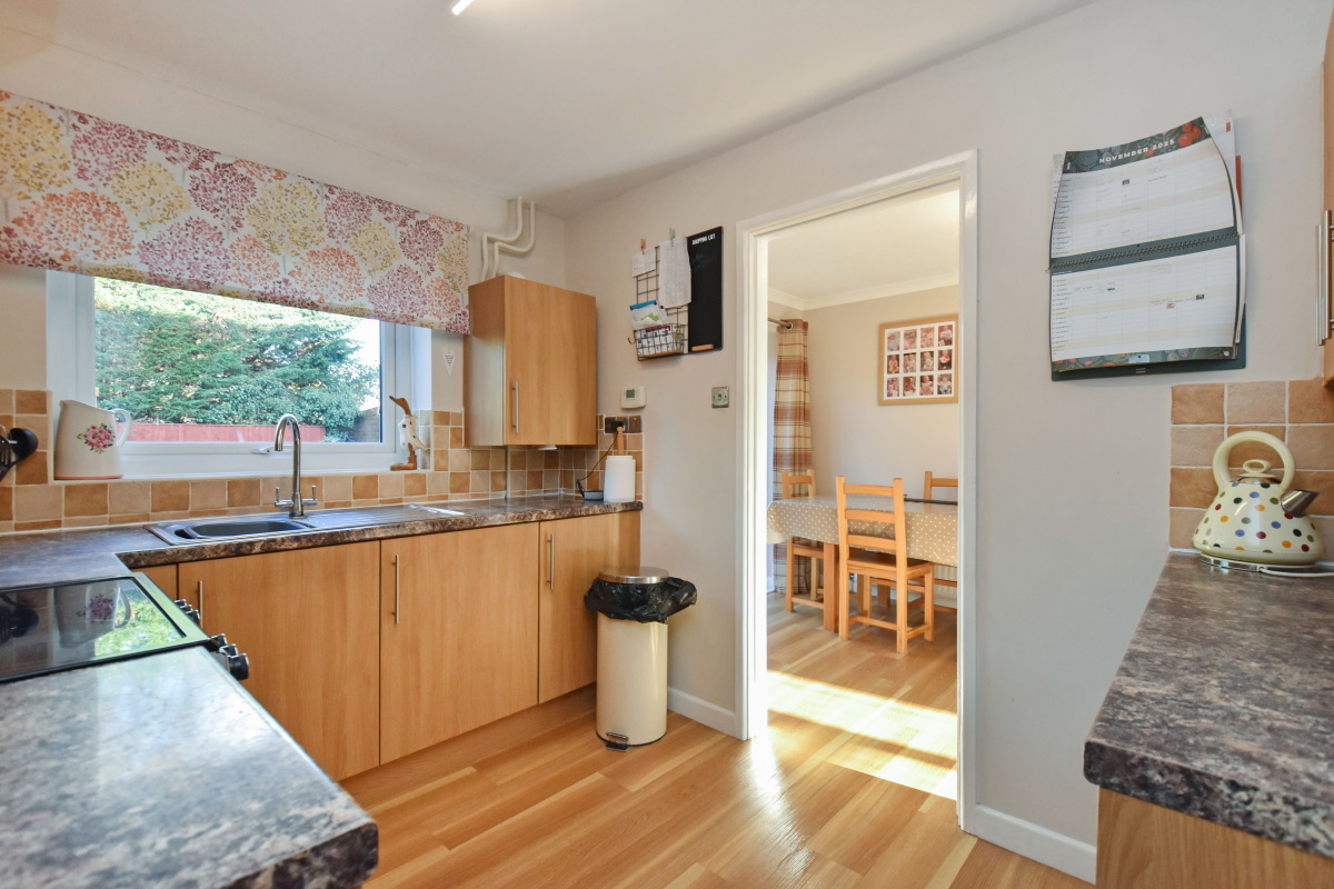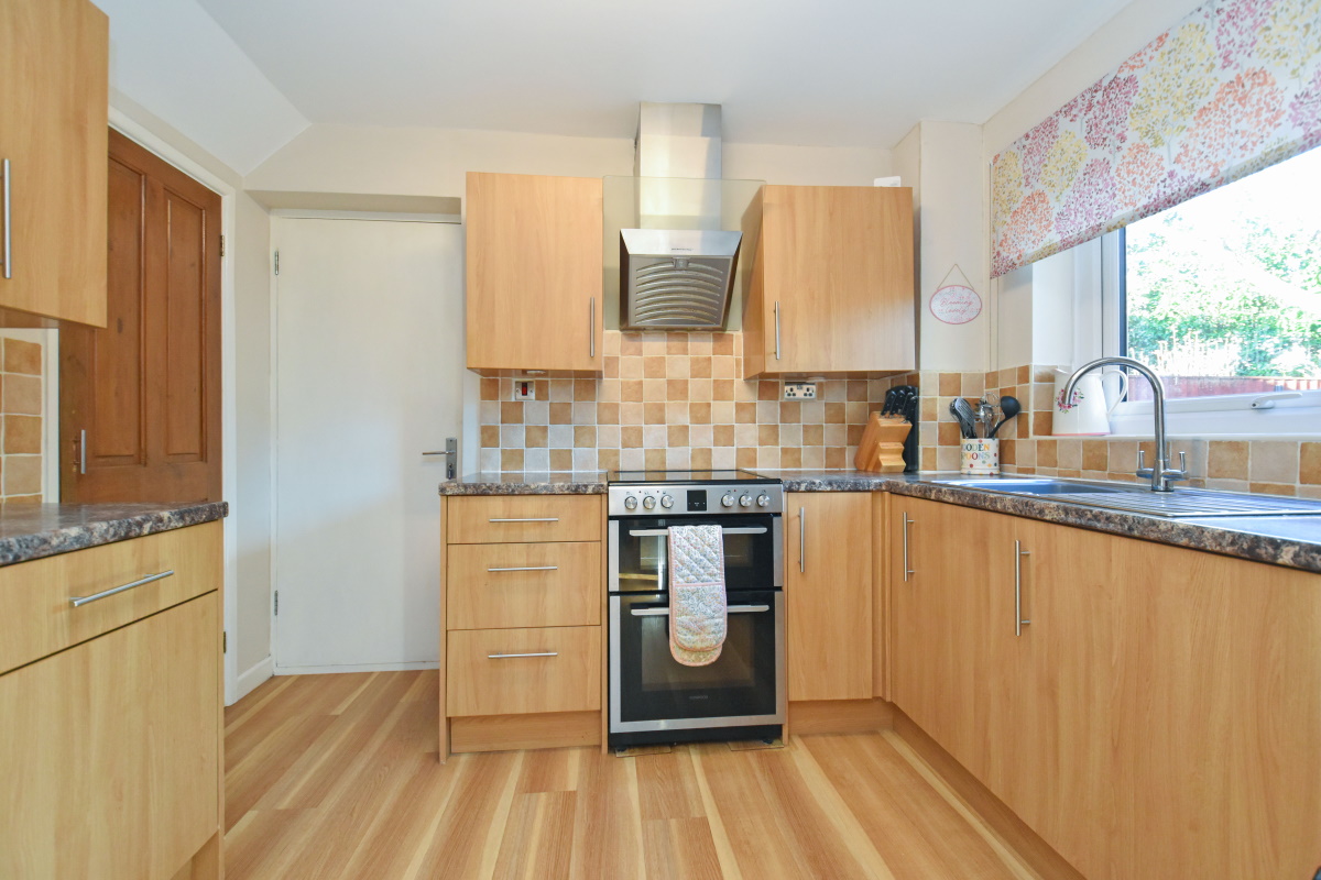 Kitchen fitted in an extensive range of both wall and base mounted cupboards, drawer pack, laminate worktop with inset stainless steel single drainer sink, one cupboard housing gas fired boiler, space for freestanding cooker with extractor over, space for undercounter fridge, access to understairs cupboard/Panty, door to Single Garage which leads to the