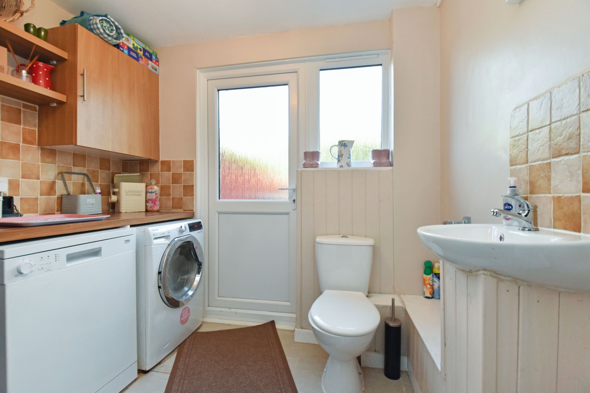 Utility Room/Cloakroom an excellent extra space with two wall mounted cupboards, laminate worktop, space and plumbing for washing machine and tumble dryer, close coupled W.C. and basin, radiator, door to rear garden, tiled flooring.