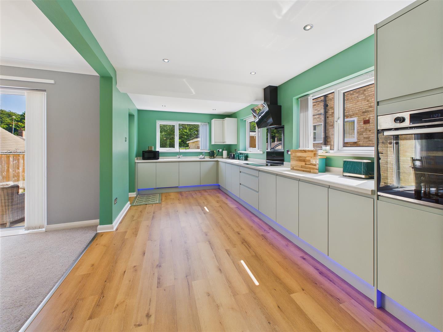 Kitchen - An exceptional kitchen having a range of contemporary handleless units with ample work surfaces, sink and drainer with mixer tap. There is also an integrated oven, four ring induction hob with extractor above, dishwasher, fridge freezer and washing machine.