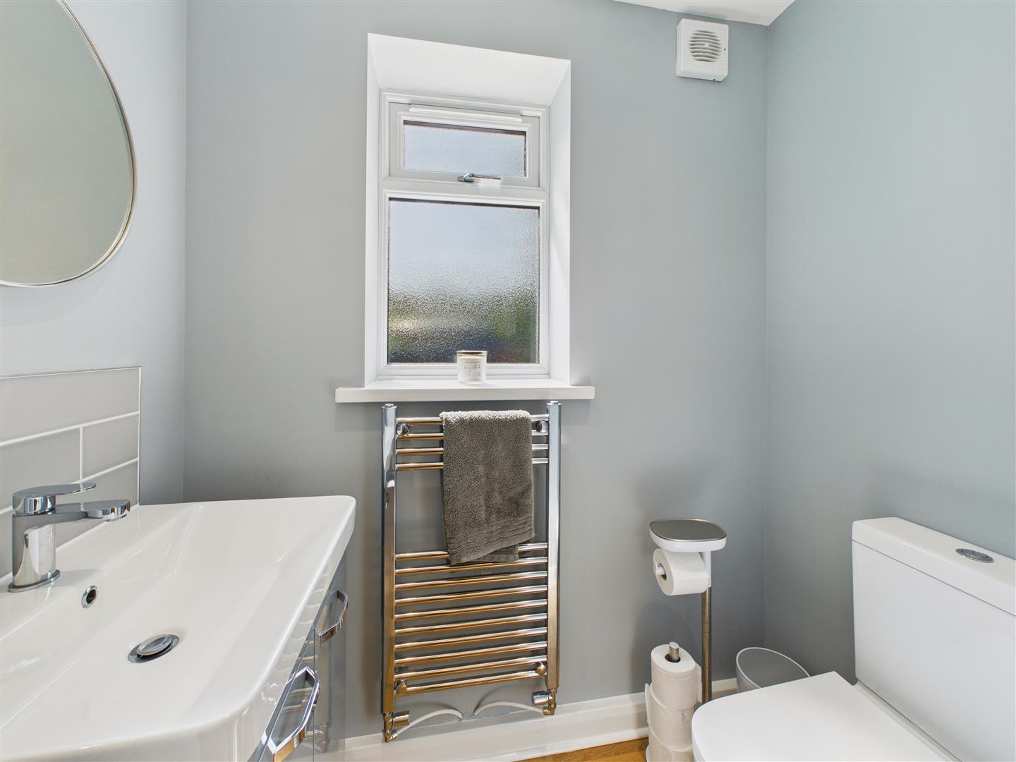 Cloaks/W.C. - A modern white suite comprising low level W.C., wash hand basin in cabinet, tiled surround, heated towel rail.