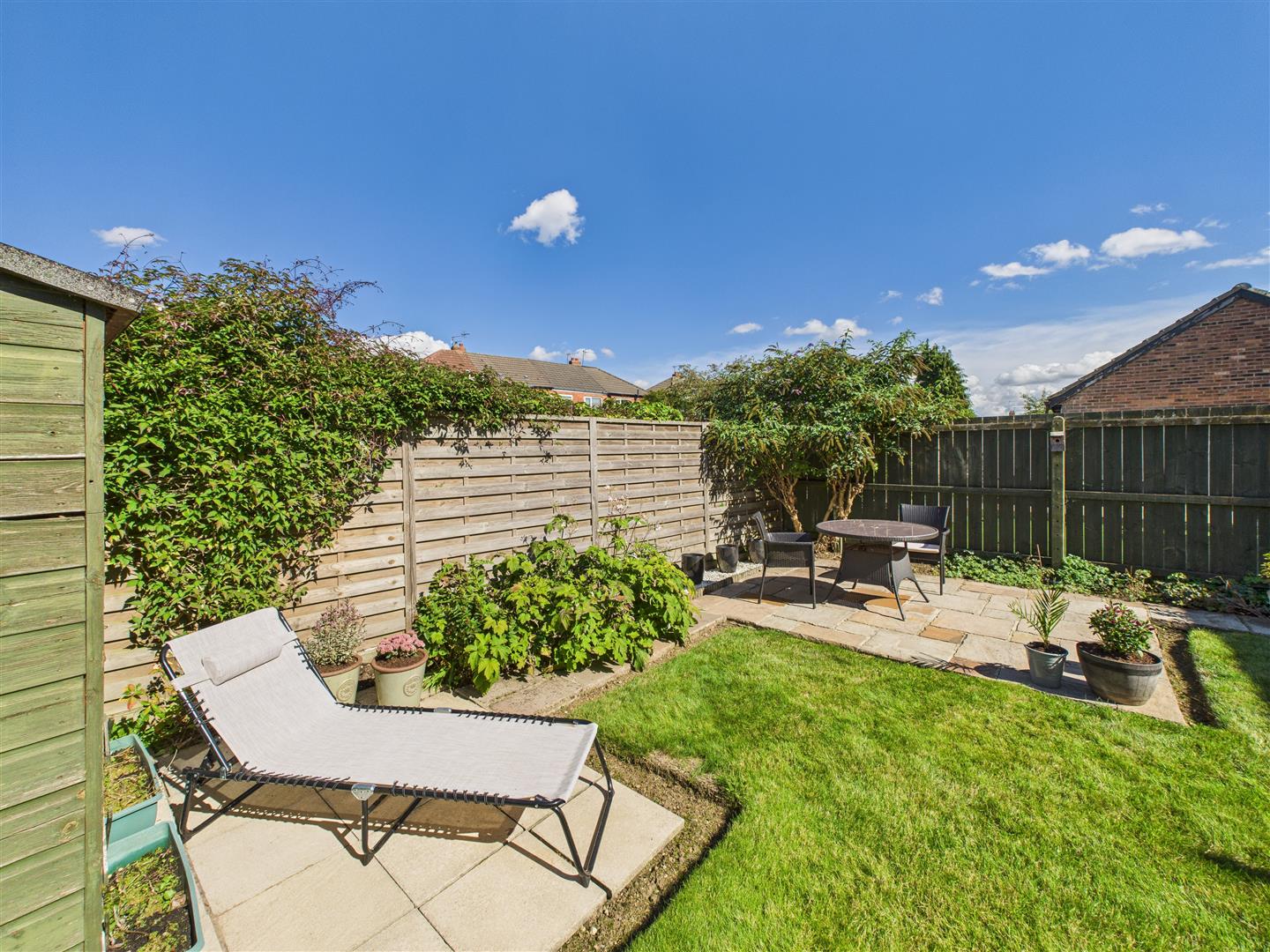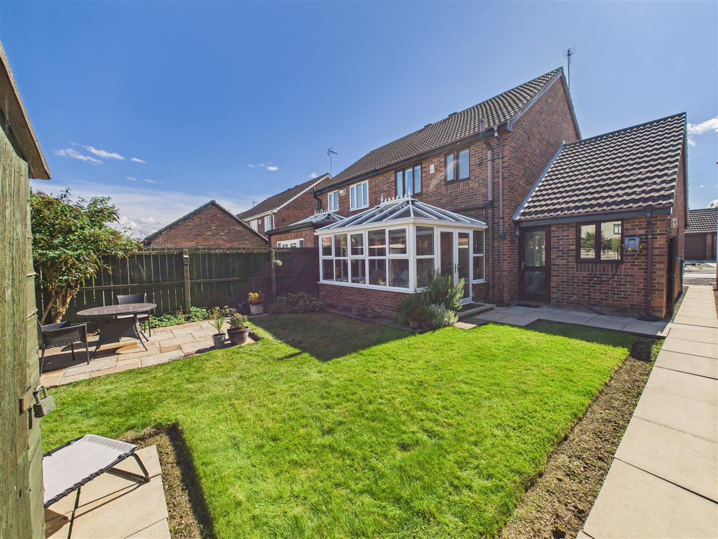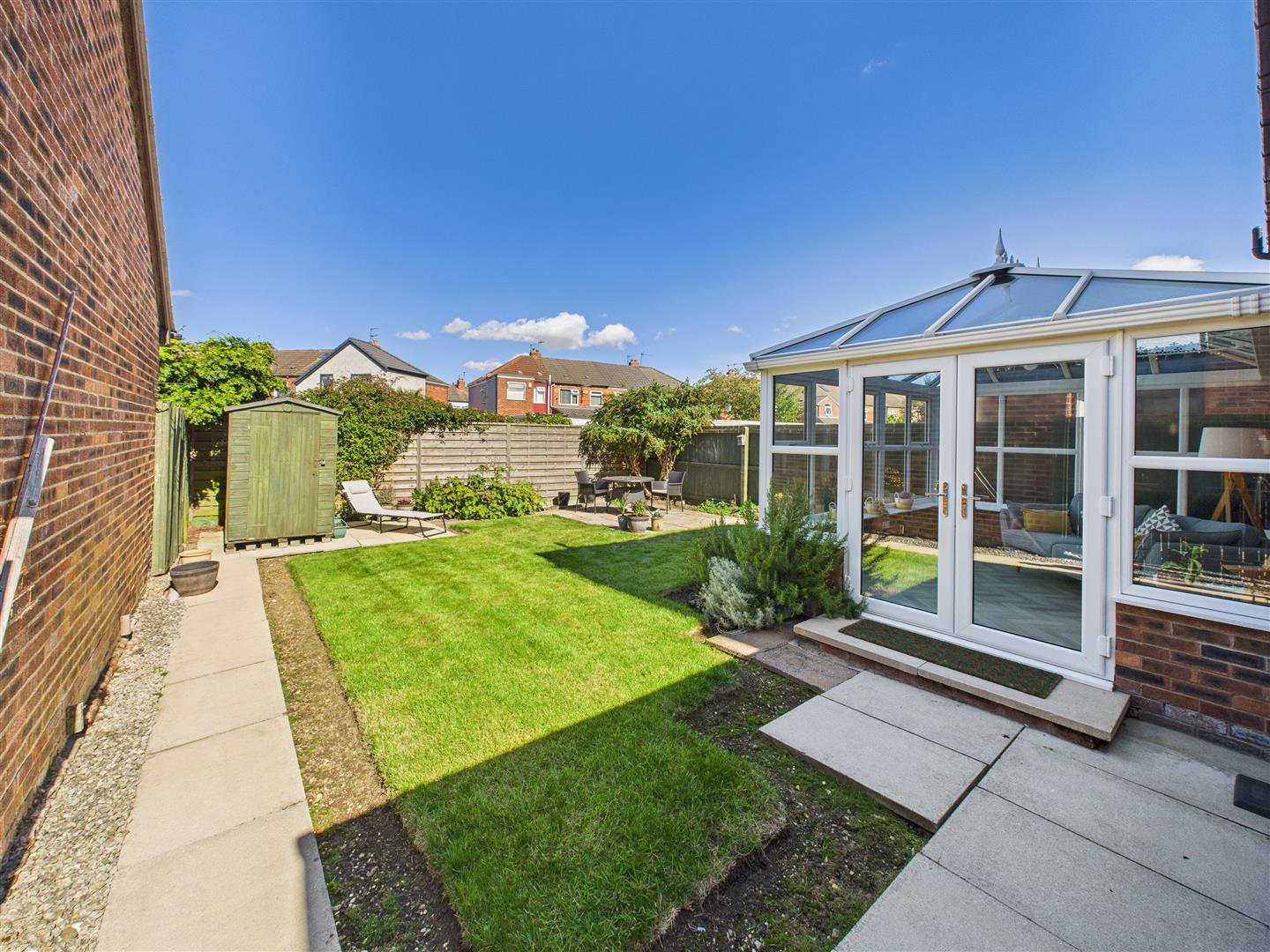 Outside - Doors opening from the conservatory and utility lead onto the rear garden, with a central lawn and paved patio to the far corner. A shed sits on a paved area to the adjacent corner. The front of the property has a lawn and a driveway, with comfortable off-street parking for up to three vehicles. The driveway leads to the single attached garage with automatic entry door.
