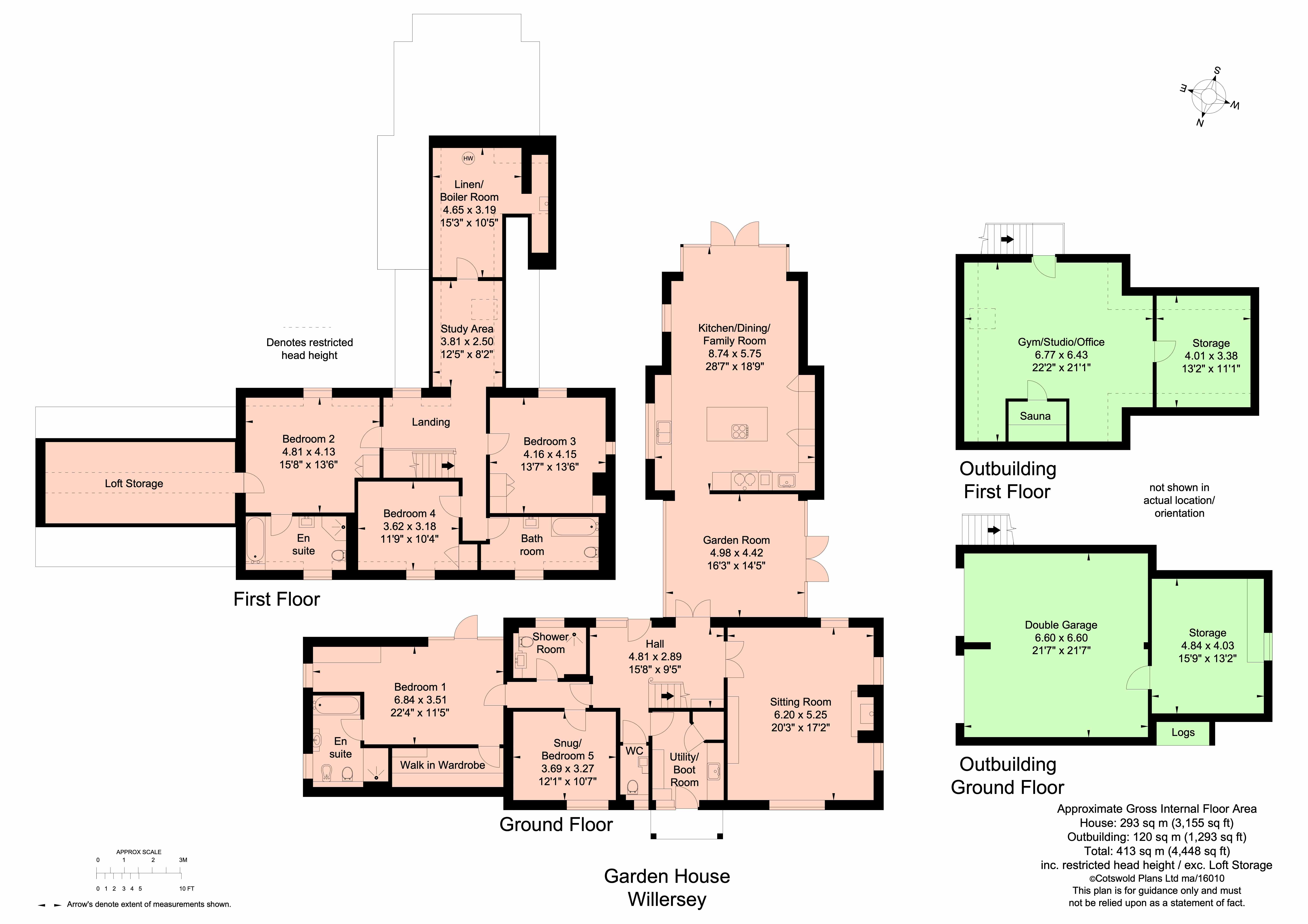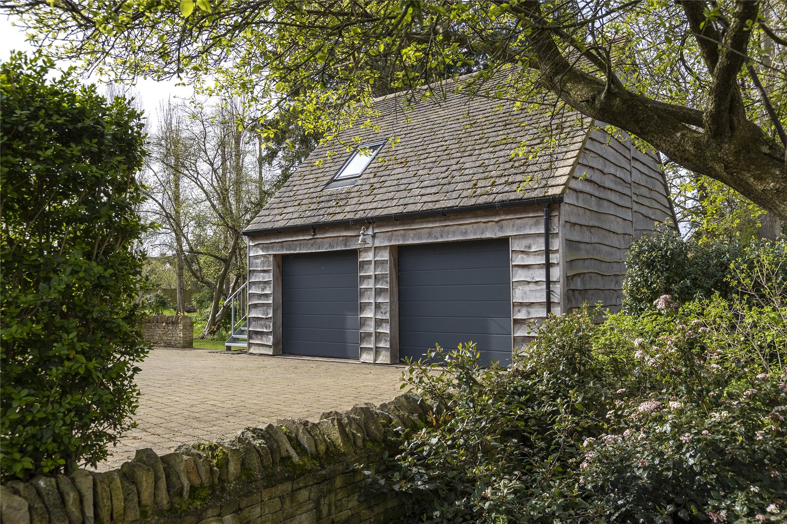 Garden House occupies a secluded and private location off the village High Street behind Rex House and is approached over the shared driveway through a set of electric timber gates. The location of the property affords a great deal of privacy and security. Beyond the first set of gates is a further electric five bar gate leading to the Double Garage. The garage has a pair of electric up and over doors, power and light and a useful workshop/store behind. A staircase to the side of the garage rises to a room above currently utilised as a Gym/Studio/Office with a Sauna.