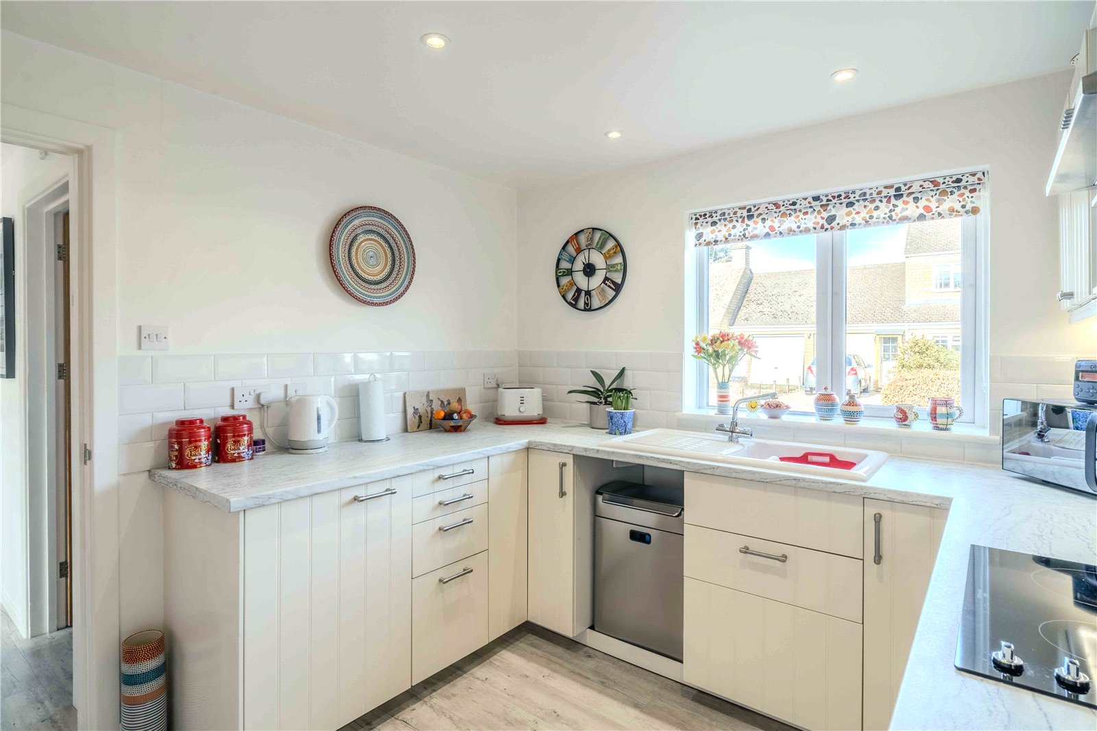 The kitchen is fitted with a range of base and wall-mounted cabinets, offering ample worktop space. It includes an under-counter fridge and space and plumbing for a dishwasher. The kitchen leads through to a practical utility room with space for a tumble dryer and under-counter freezer, along with a door giving convenient access to the driveway. From the utility room, a further door leads to the pleasant third bedroom, currently arranged as a home office. This versatile space benefits from access to the rear garden and a storage cupboard housing the Worcester boiler.