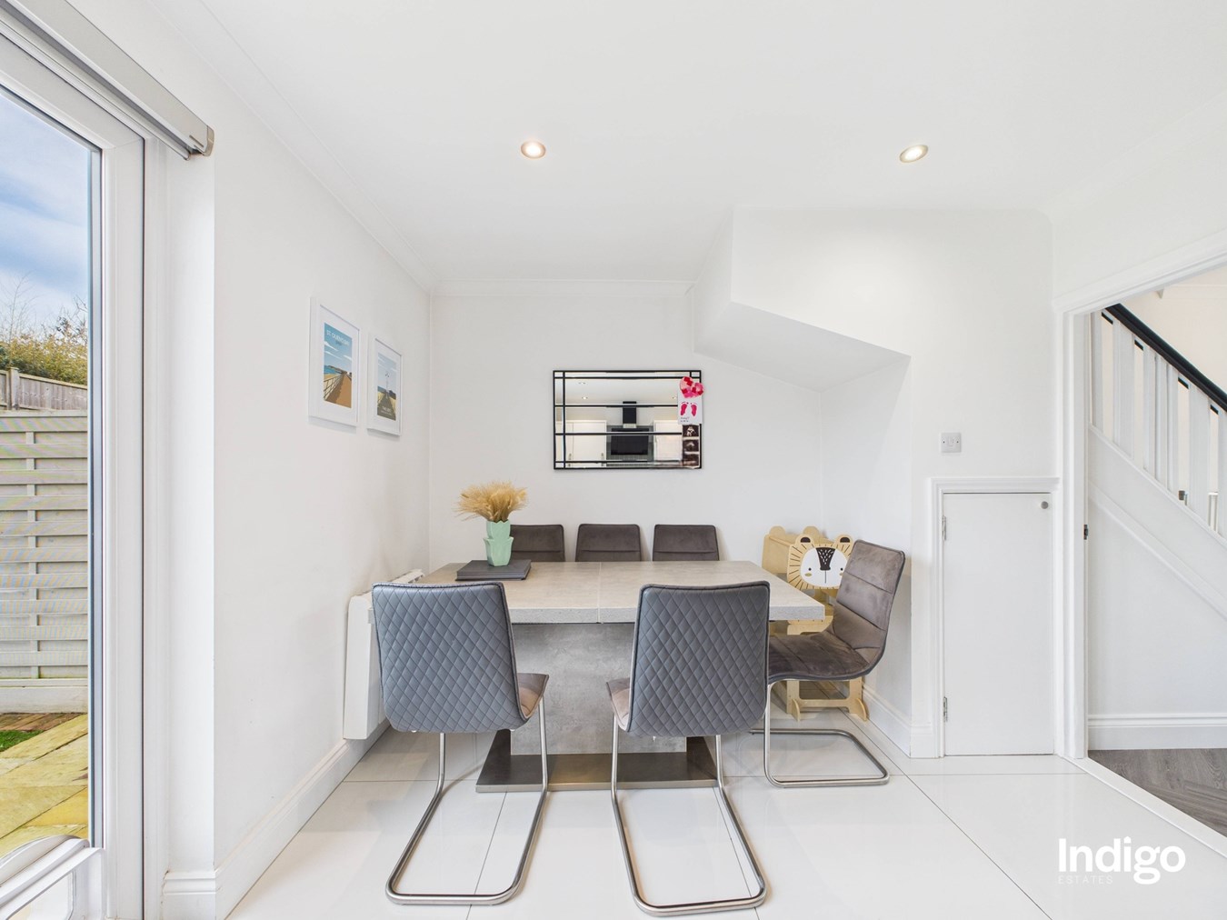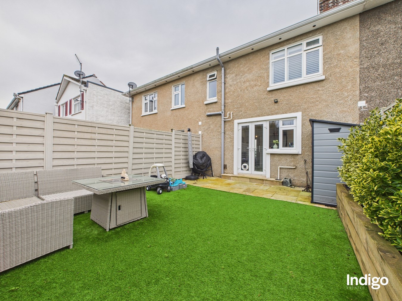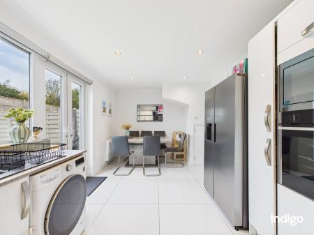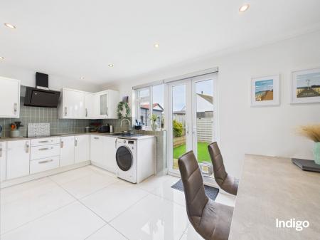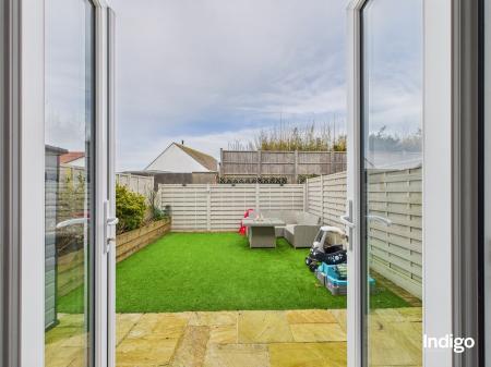 The accommodation comprises three well-proportioned bedrooms and a house bathroom, along with a separate bright and cosy living room. The integrated kitchen with dining area forms the heart of the home, featuring double-glazed French doors that open directly onto a low-maintenance enclosed garden, finished with paving and artificial lawn, ideal for relaxed family living and entertaining.