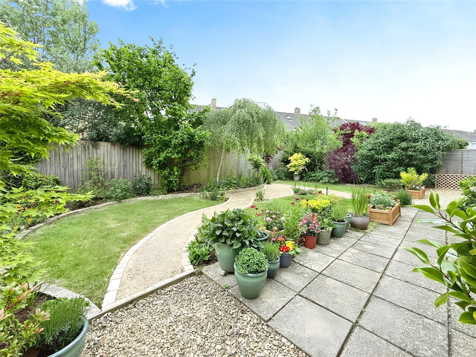 the silver birch tree. The garden has a mixture of flowering plants, fruit trees, and