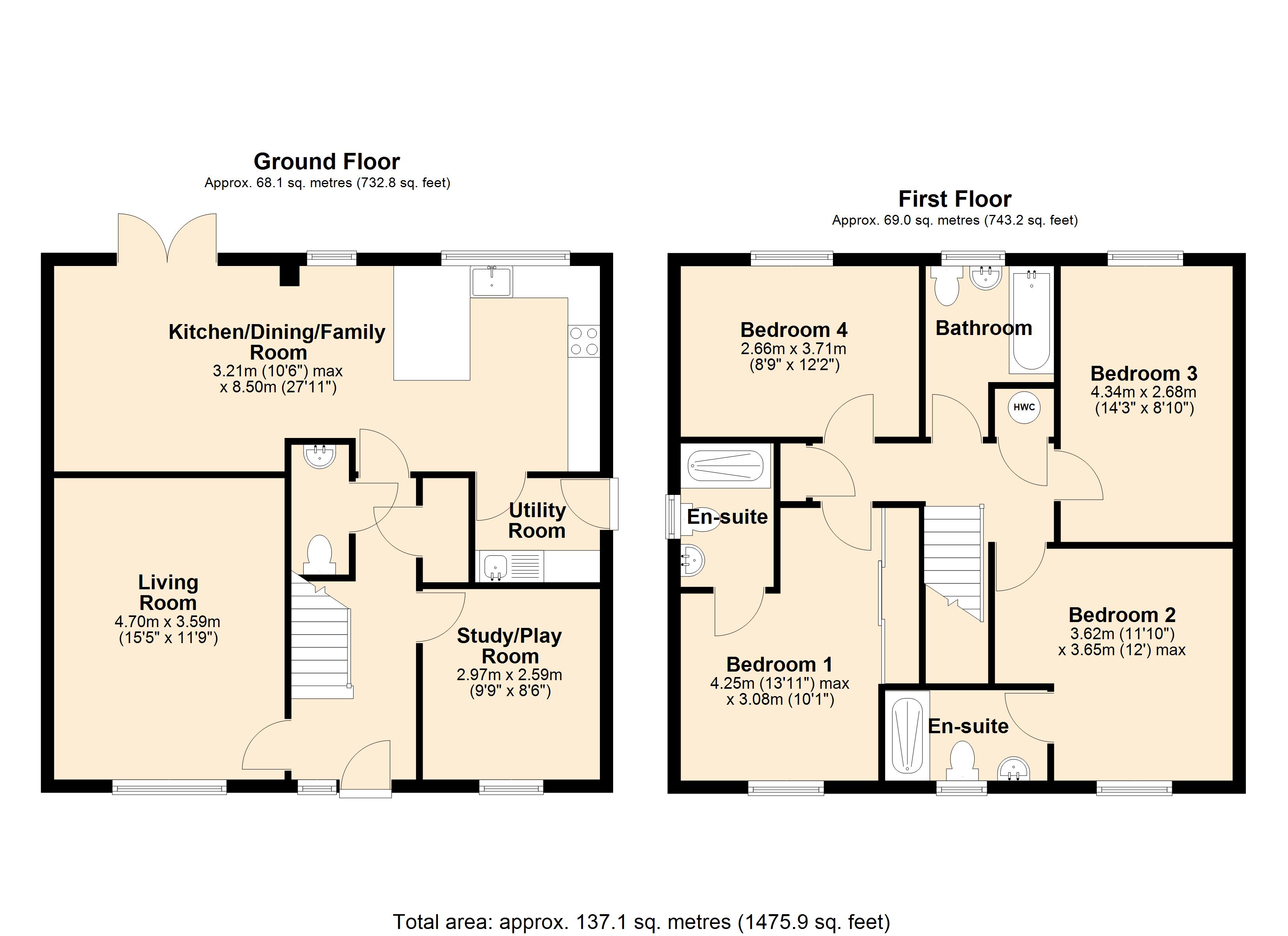 The welcoming entrance hall has stairs to the first floor as well as doors to the living room, cloakroom, kitchen-diner and study. A wonderful space to relax, the living room is a great size and features large windows to the front. Spanning the full width of the house, the kitchen-diner is a stunning entertaining space fitted with a selection of stylish units and a great deal of work top space. There is a door to a useful utility room as well as French doors and large windows onto the garden. Ideal for use as a home office, the spacious study could equally suit as a play room or even a fifth bedroom if required. Heading upstairs, each of the four bedrooms are good doubles with bedrooms one and two both having ensuite shower rooms. Completing the internal accommodation is the bathroom.