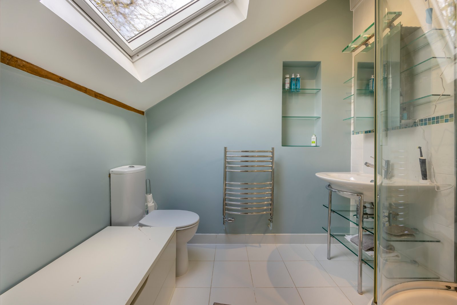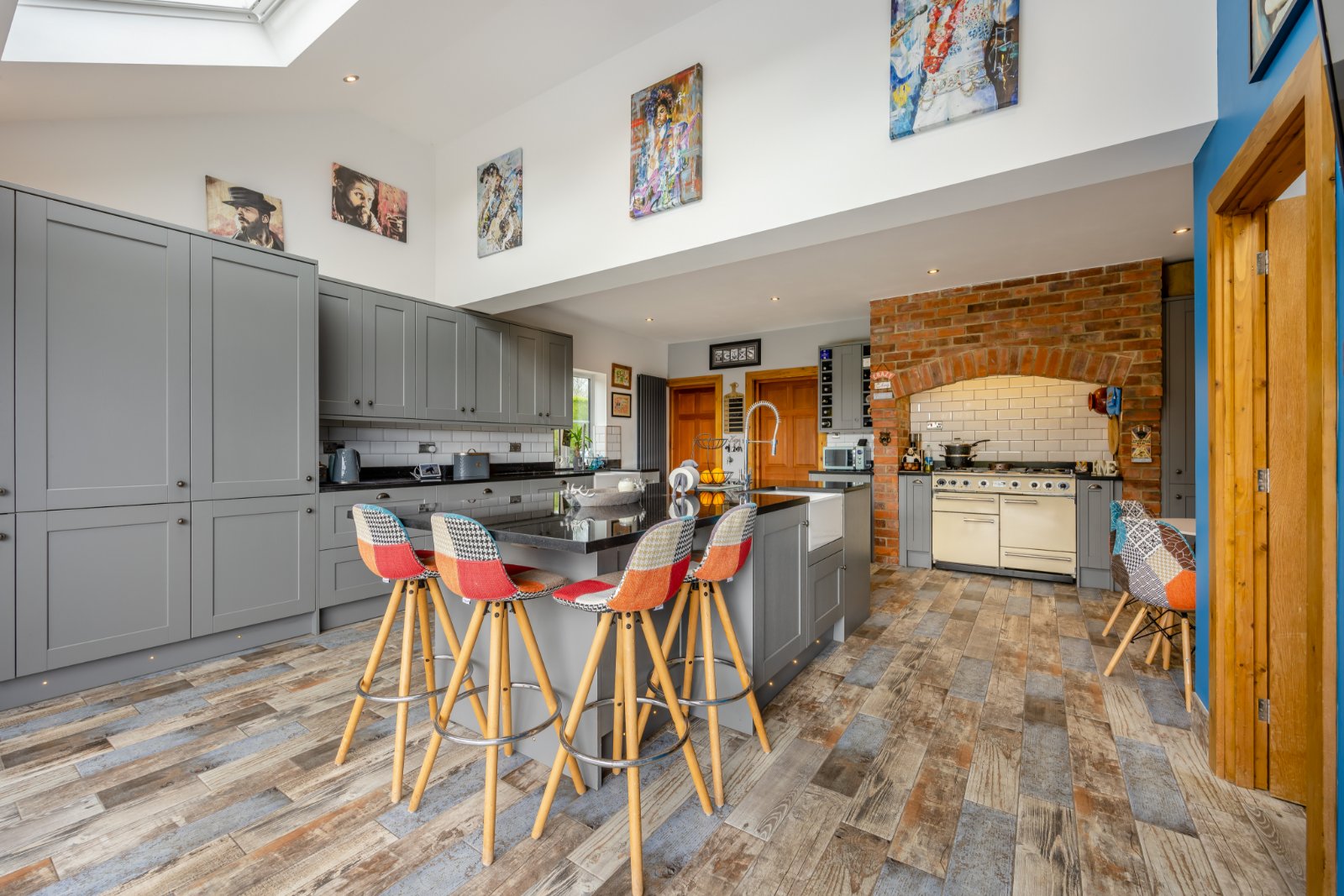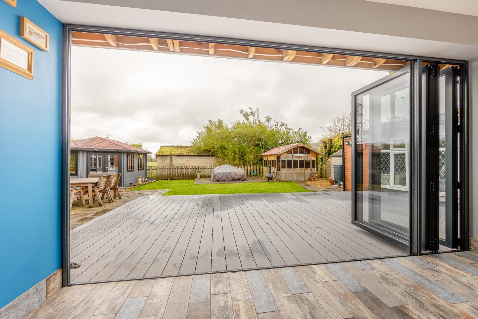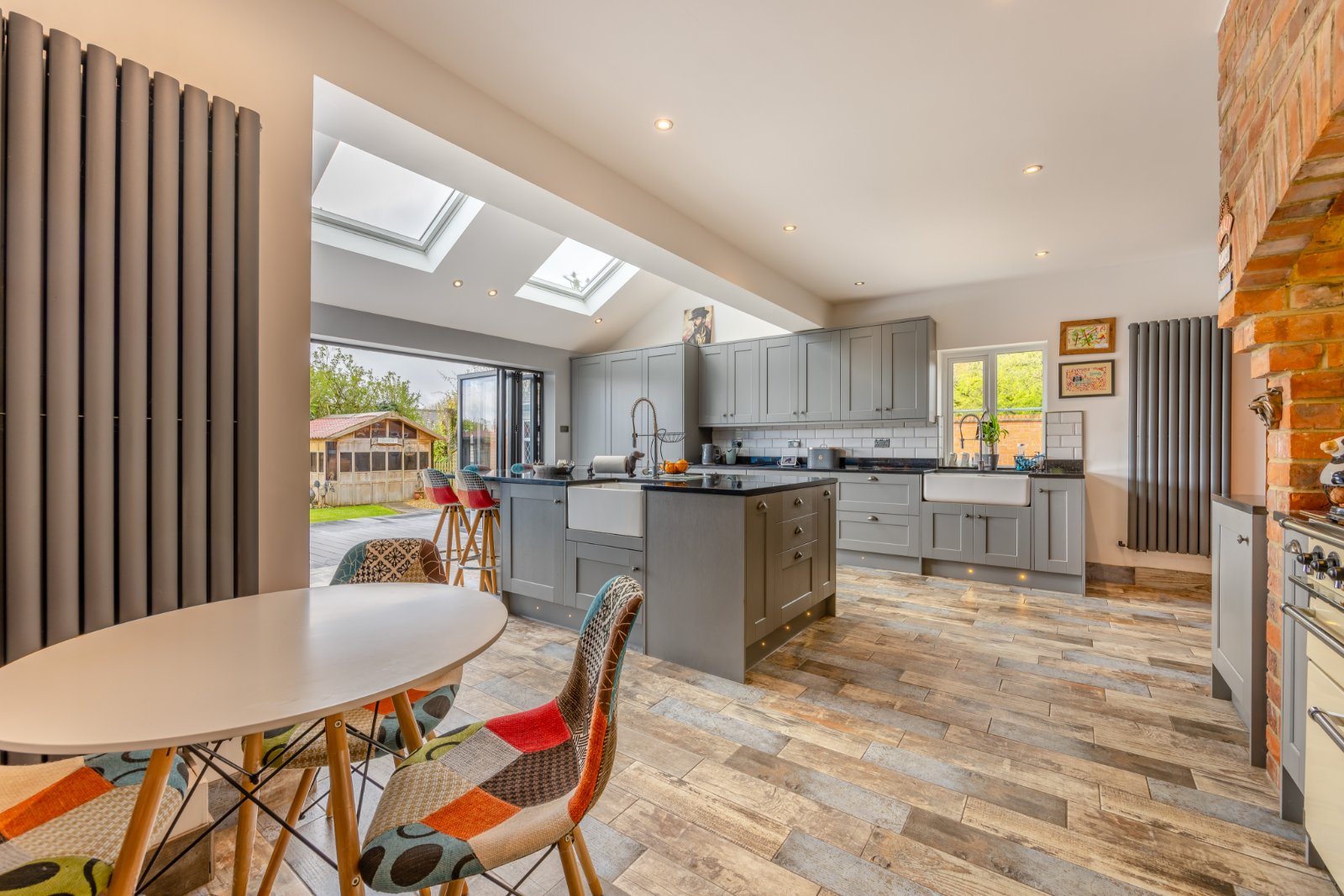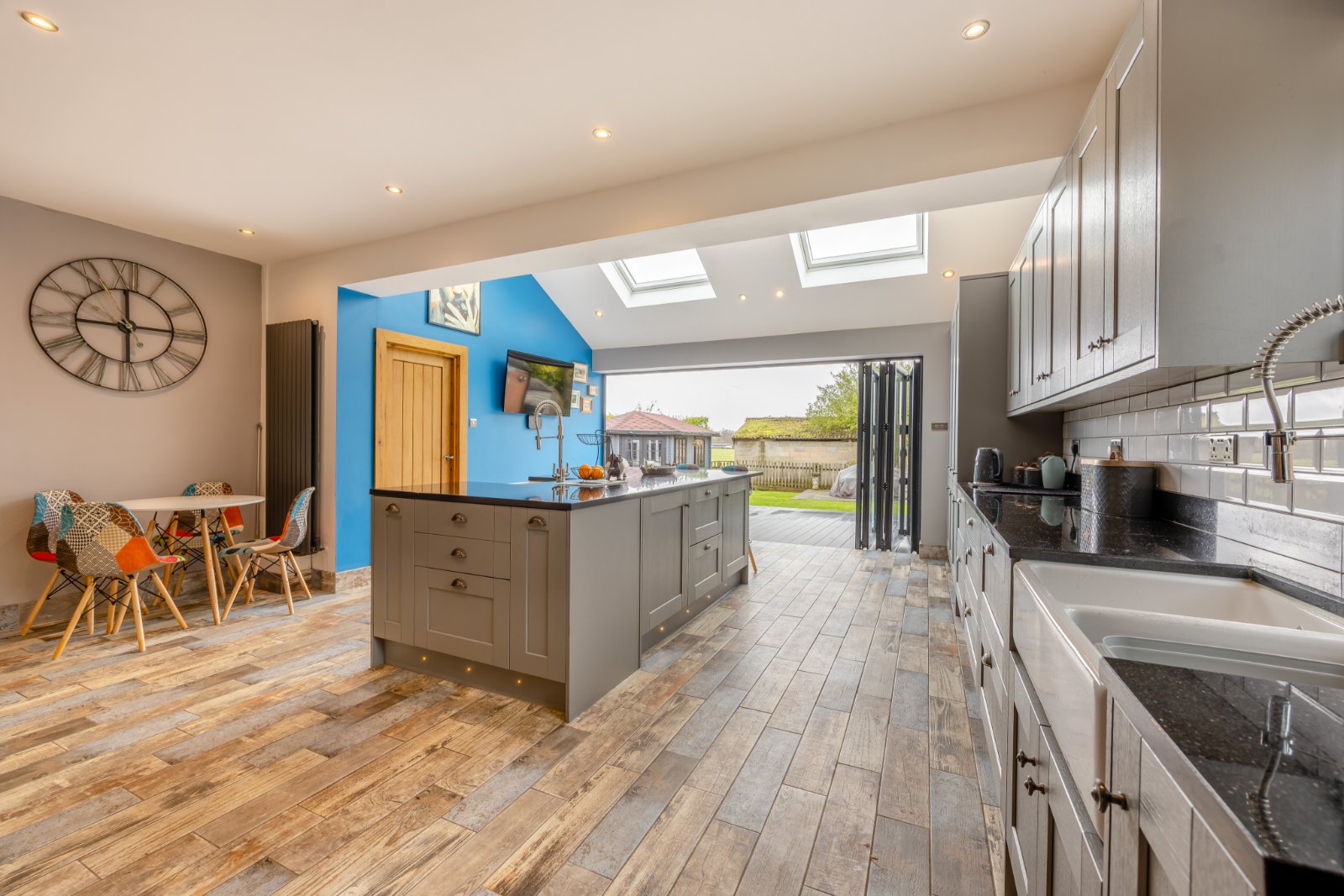 A particular standout feature is the central island with vaulted ceiling and Velux windows, along with bi-folding doors leading to the decking area of the garden.