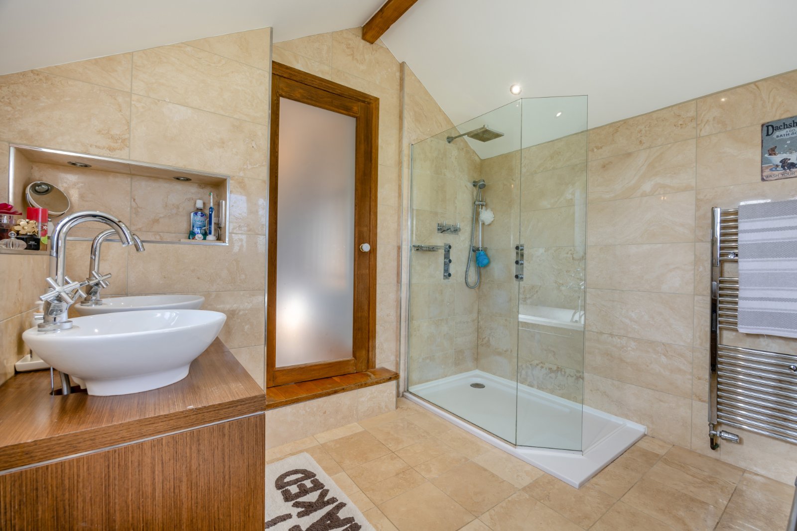 Upstairs, there are four double bedrooms, two of which have ensuites. The main bedroom boasts a jack and jill dressing room with a feature ensuite, complete with a roll-top bath, walk-in shower, and his and her basins.