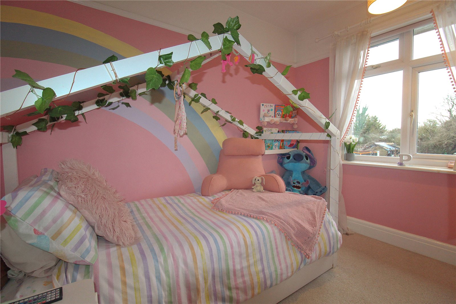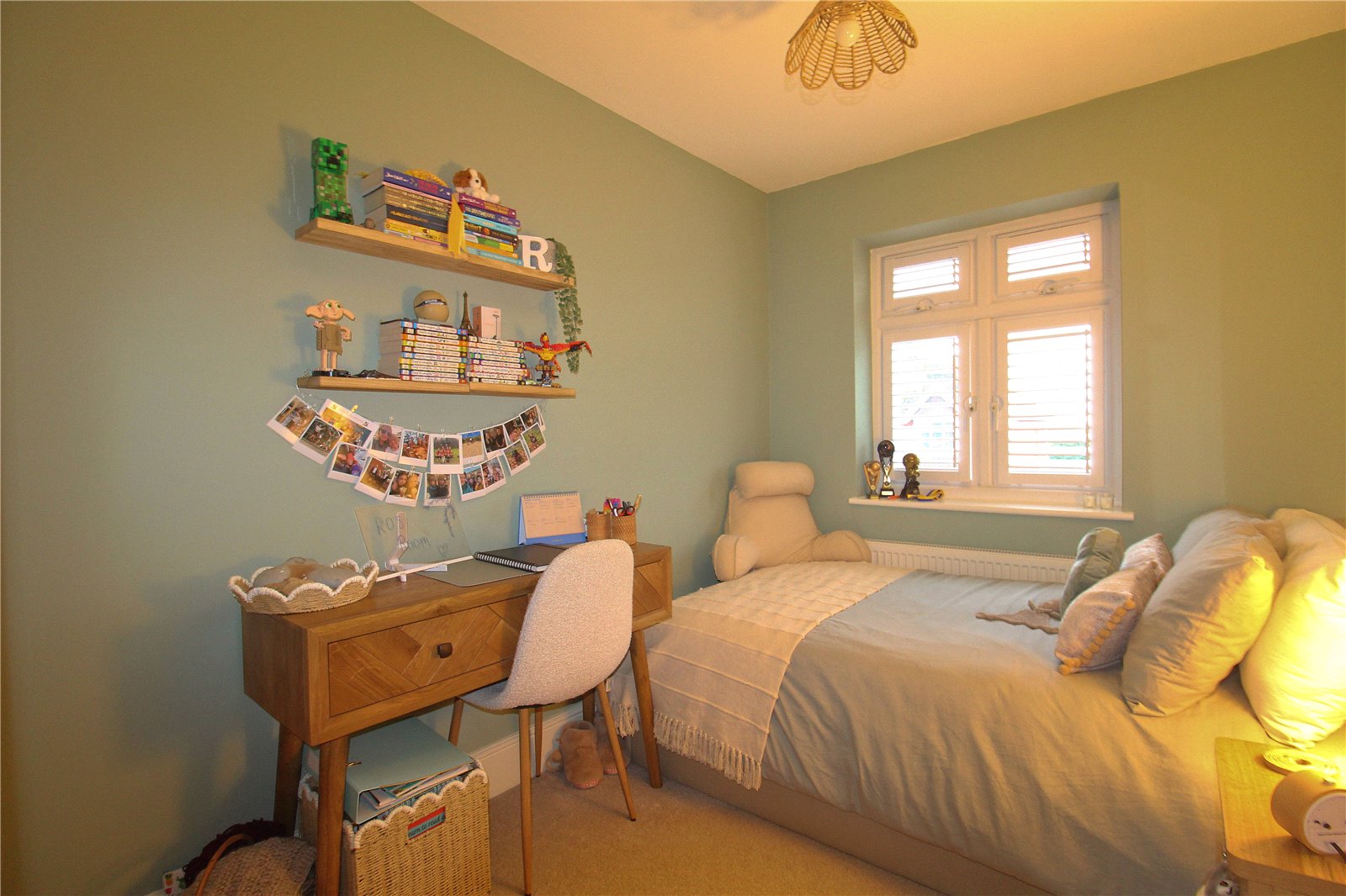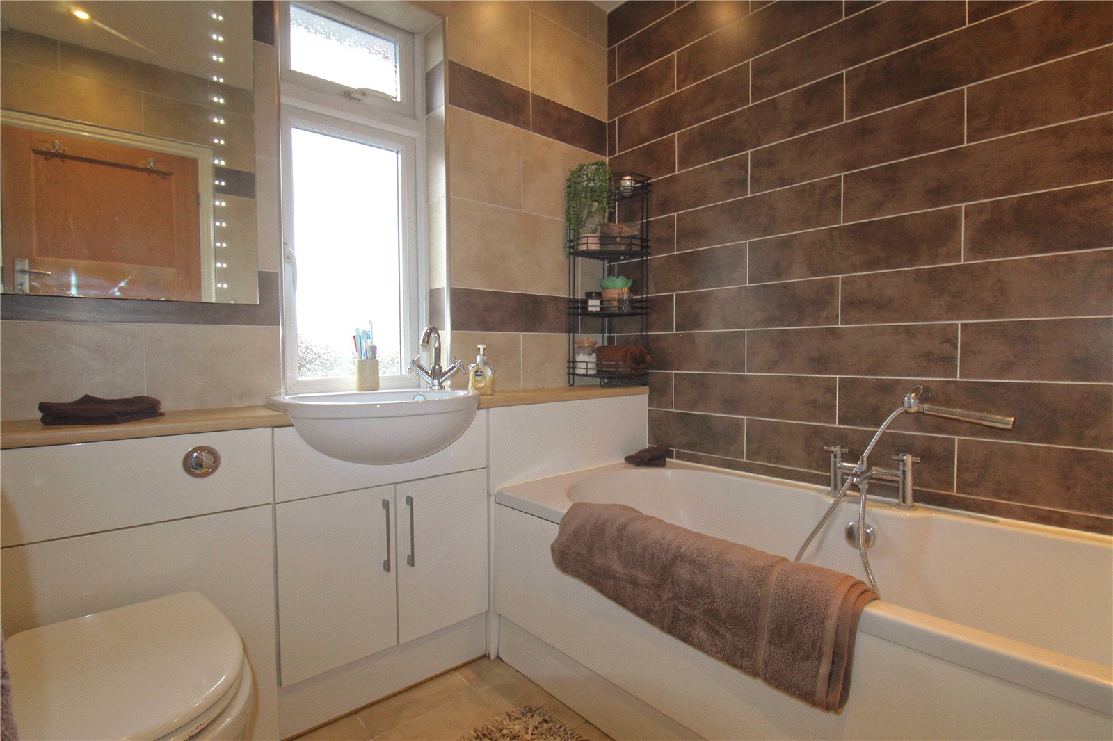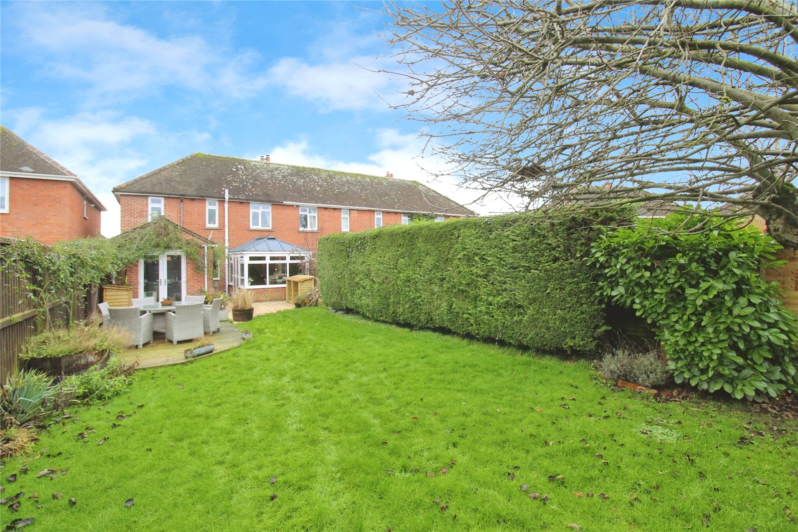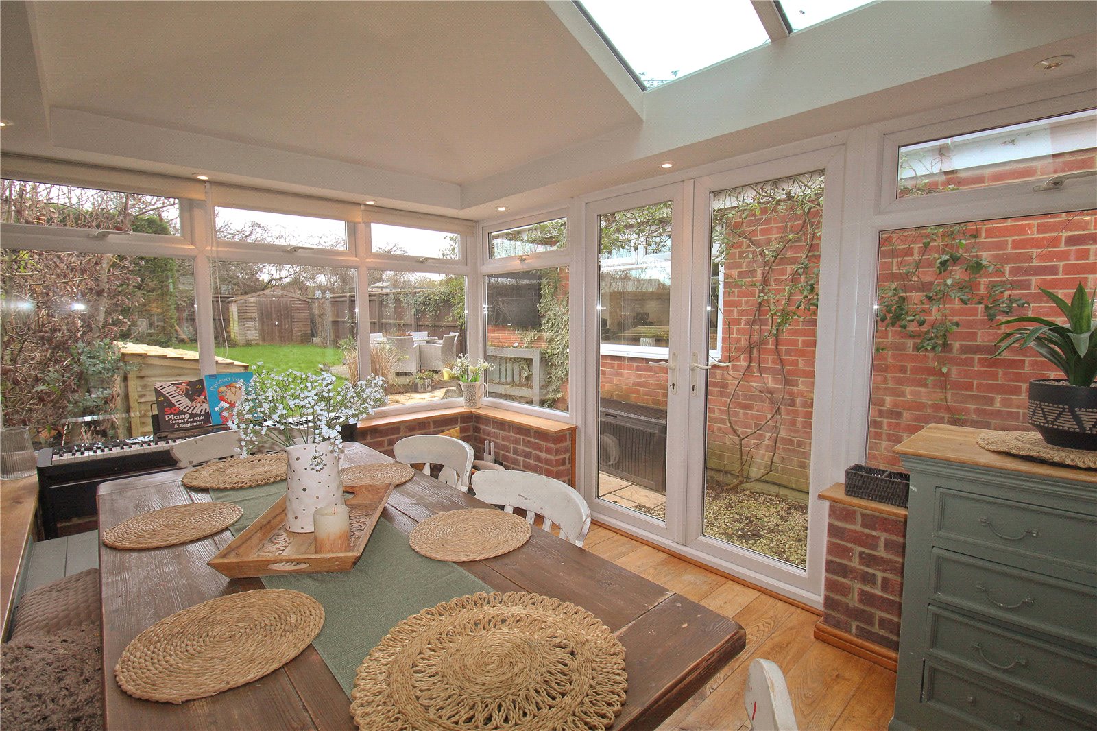 To the front of the house you find a front garden which is laid to lawn as well as a resin driveway providing off street parking. The rear garden is an excellent size, predominantly laid to lawn with a patio and decking area, ideal for dining al fresco. There are a selection flowering plants and an impressive apple tree as well as external power points and a gate providing side access via a shared path.