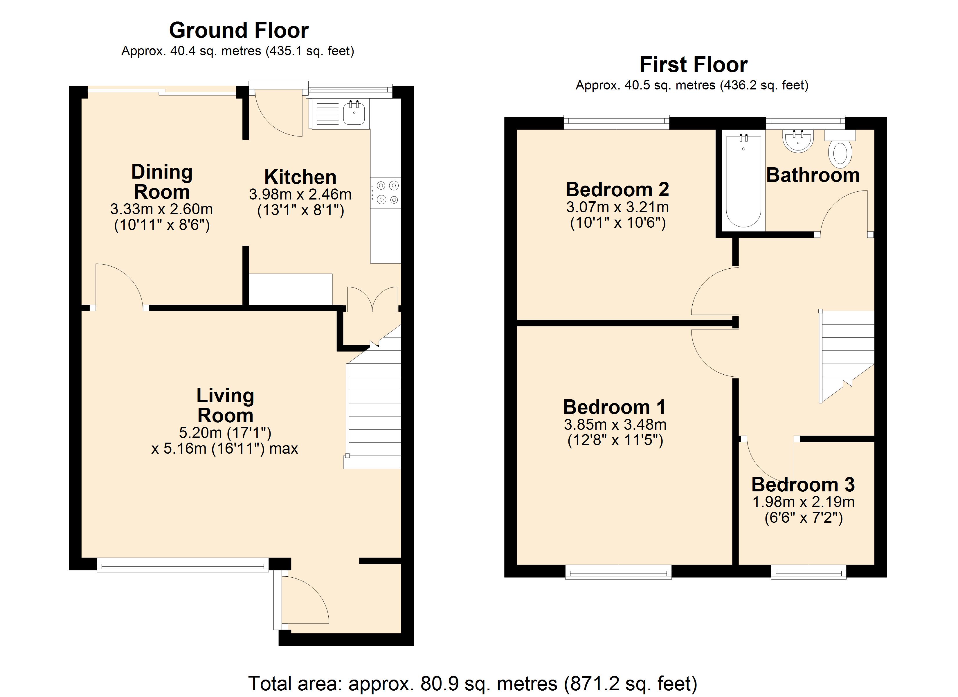 Heading upstairs, the landing provides access to all three bedroom and the bathroom. Bedrooms one and two are both comfortable double rooms whilst bedroom three is a single, which could also serve as a useful office space. Completing the internal space, the bathroom has a bath with shower over, WC and wash basin.