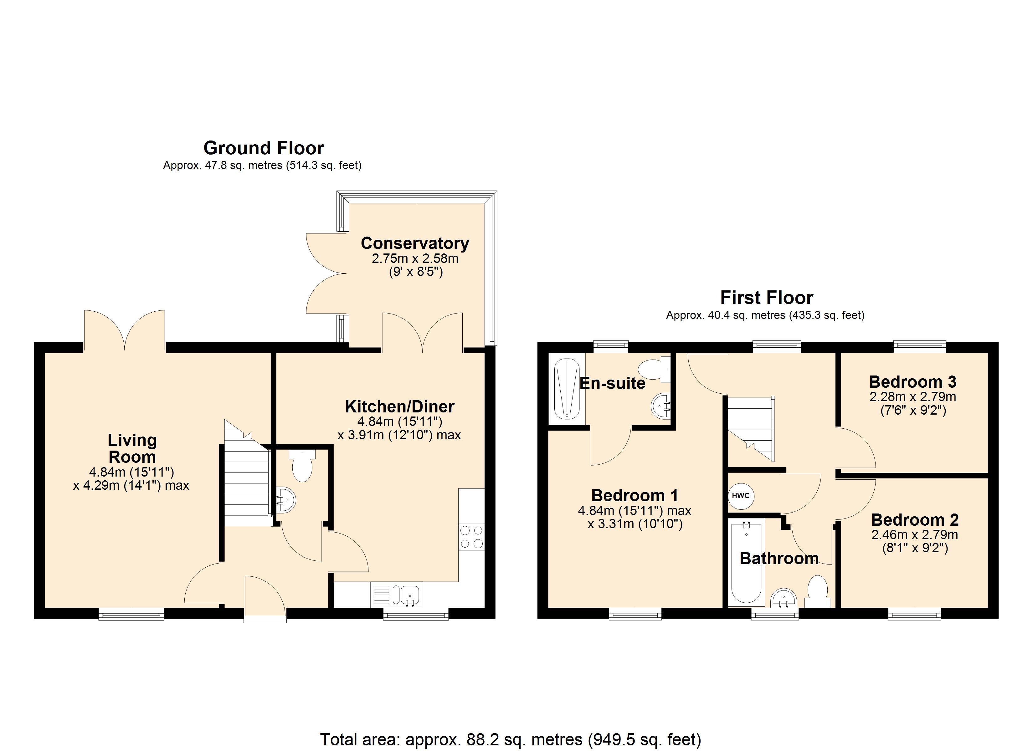 Stepping into the property, you find a central entrance hall with stairs to the first floor as well as doors to the downstairs cloakroom, dual aspect living room and kitchen diner. A great space to relax in front of the telly the living room has a window to the front and French doors onto the garden. This room extends under the stairs providing a useful nook that could be used as a desk space. The kitchen diner meanwhile is a great size with a selection of fitted unit units with work surfaces over. There's plenty of room for a table and chairs as well as French doors that lead into the conservatory. Here you find a bright space with a glass roof and French doors onto the garden. Moving upstairs, the landing has doors to each of the three bedrooms and the bathroom as well as the airing cupboard housing hot water tank. The main bedroom is a fantastic size with plenty of space for a double bed, bedside tables and wardrobes. There is a door to the ensuite shower room where you find a double shower cubicle, WC and wash basin. Bedrooms two and three are similarly sized and capable of taking a double bed or being used as a large single. Completing the internal accommodation is the bathroom which has a bath, WC and wash basin.