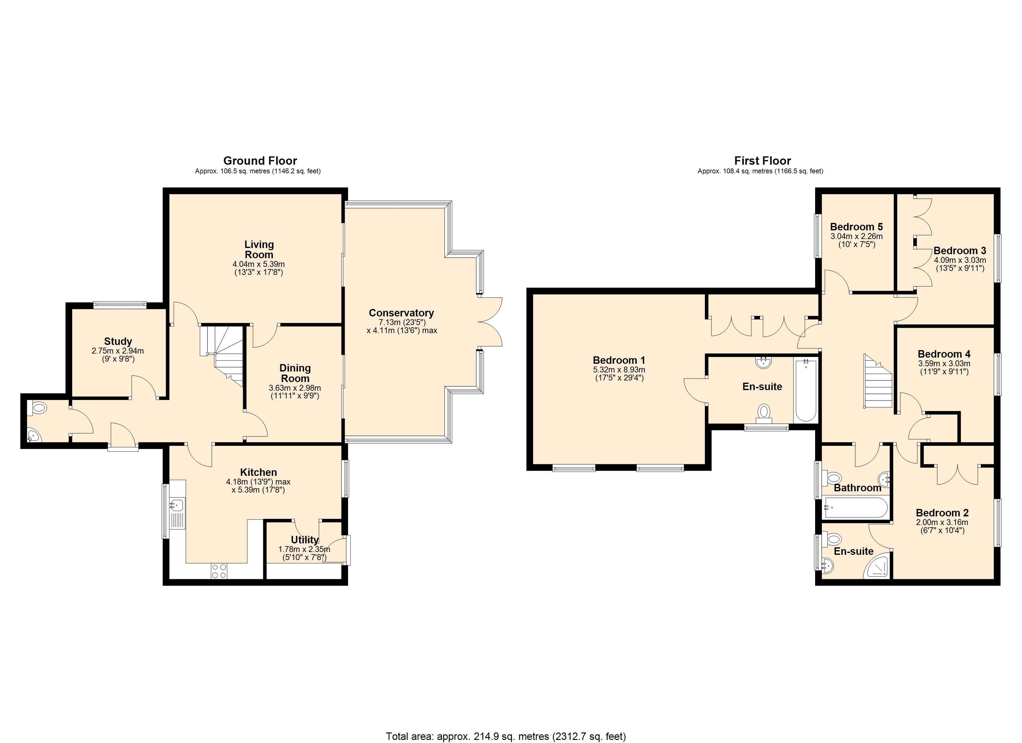 Heading upstairs, the landing provides access to all five bedrooms and the bathroom. Bedroom one is an incredible size with tons of built in wardrobe space and two windows allowing light to flood in. There is also a door to the first en suite which has a bath with shower over, WC and wash basin. Bedroom two is another large double with built in wardrobes and an en suite which has a double shower cubicle and wash basin. Bedrooms three and four are both comfortable doubles, with views of the rear garden as well as built in wardrobes in bedroom three. Bedroom five is a comfortable single bedroom, whilst completing the internal space the bathroom has a bath with shower over, WC and wash basin.