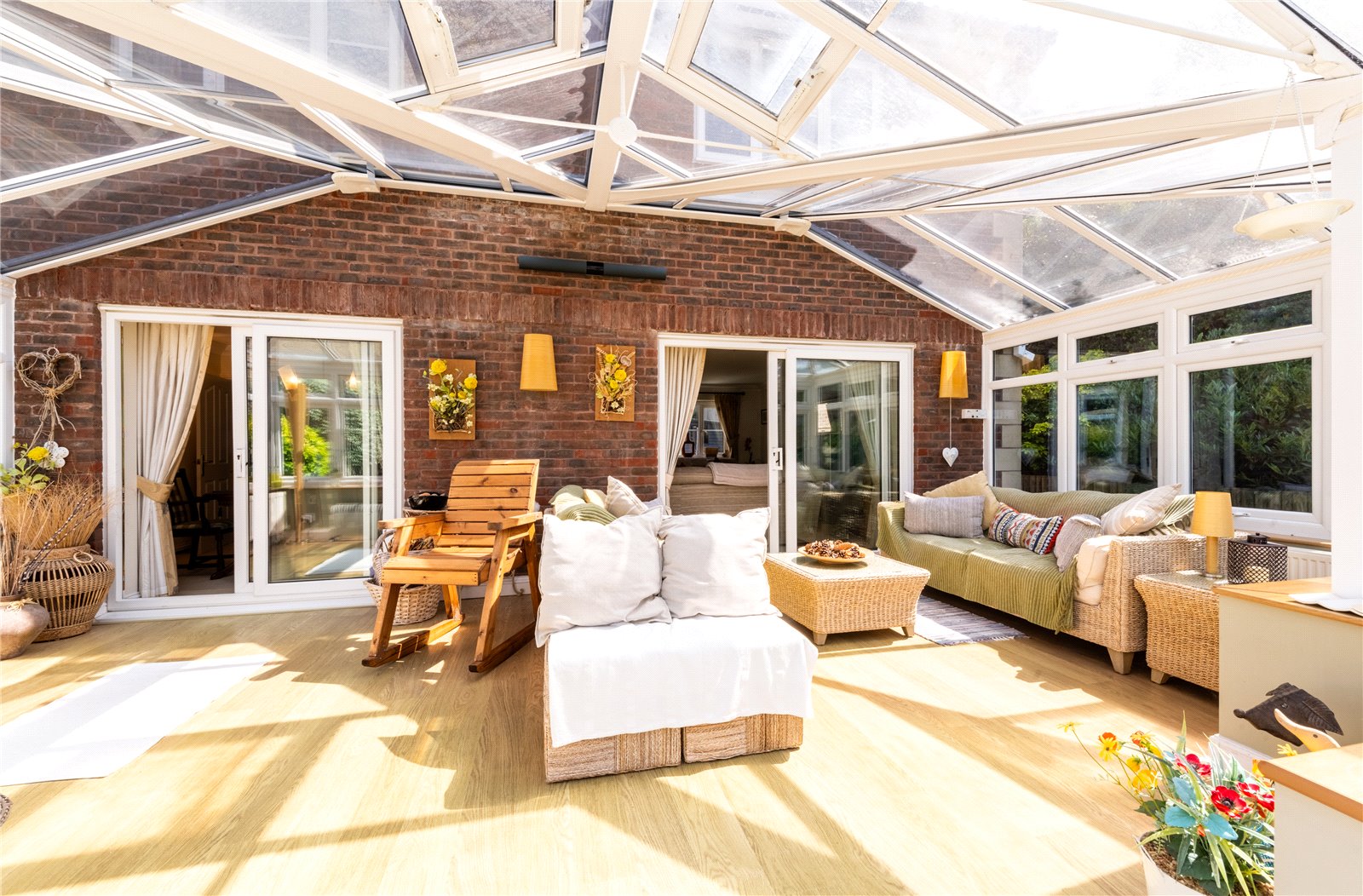 Stepping into the property, the hallway has doors to each of the key downstairs rooms as well as stairs to the first floor. Fitted with oak units and granite work surfaces, the kitchen is a great space with a door to the useful utility room which has plumbing for appliances and a door to the garden. The dining room is another useful space with plenty of room for a large dining table and has a door to the living room, as well as patio doors to the conservatory. The dual aspect living room is an amazing space which is flooded with natural light and has patio doors to the conservatory. With great views of the rear garden, the conservatory is a real feature piece of the property offering a large social space to relax in the sun, French doors lead to the garden and the conservatory has a glass room making it much more thermal efficient. The study which could serve multiple purposes such as a playroom, is another good space and completing the ground floor is the cloakroom which has a wash basin and WC.