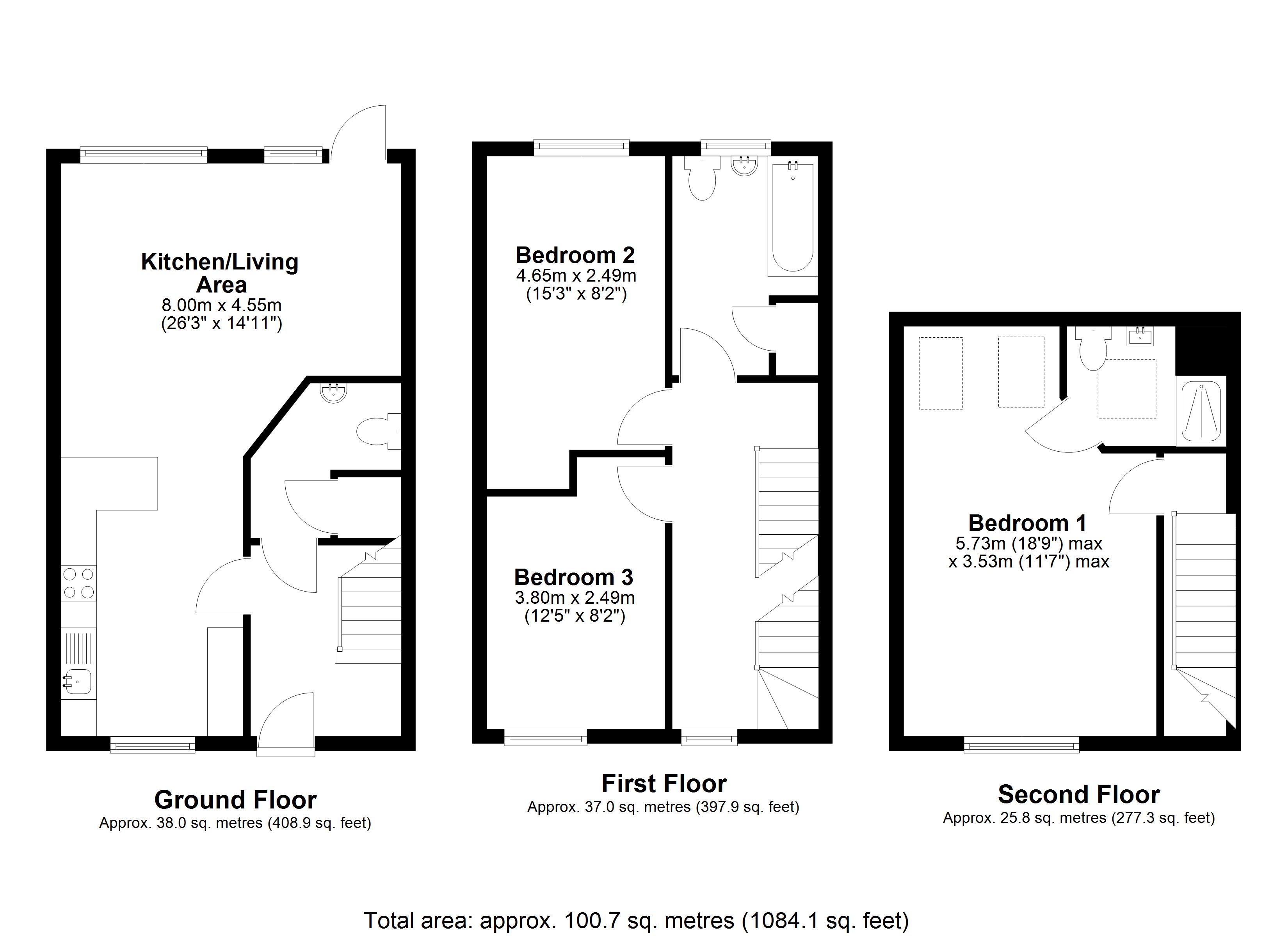 As you enter the property you are greeted by a bright and airy hallway leading into a wonderful open plan kitchen/living/dining room with dual aspect windows, a breakfast bar and a rear door leading out to your garden. This room is the hub of the home and is perfect for entertaining guests or family evenings together. A convenient cloakroom concludes the ground floor. The first floor continues to impress with two spacious double bedrooms. A family bathroom with large airing cupboard completes the first floor. The second floor is a magnificent principal bedroom with ensuite shower room.