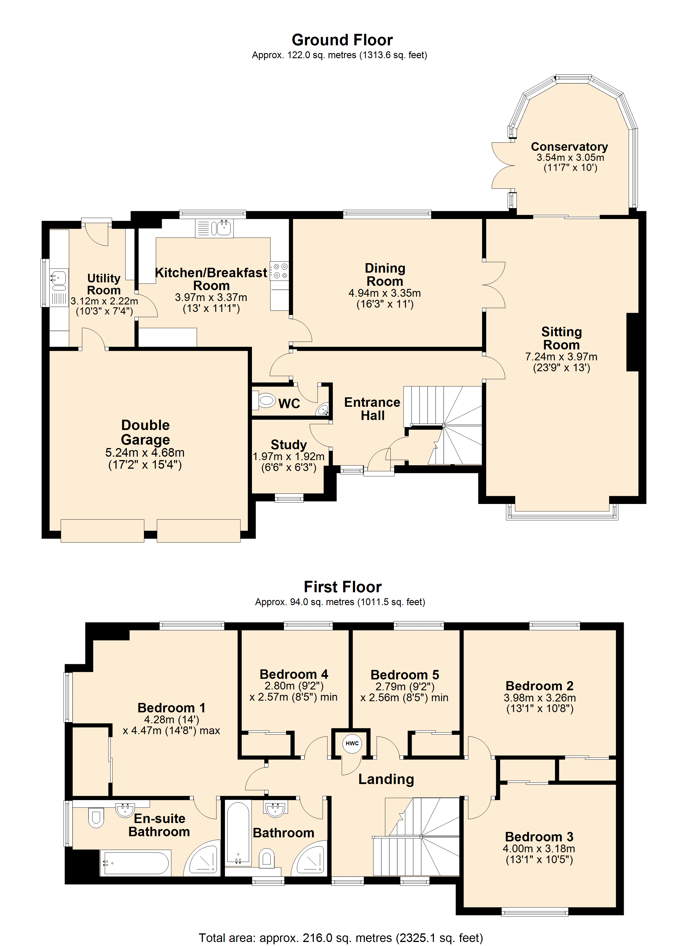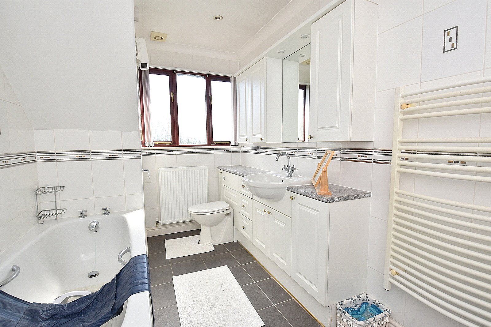 Upstairs, there are five generously sized bedrooms, each with fitted wardrobes. The principal bedroom benefits from its own en-suite bath/shower room, while the remaining rooms share a well-appointed family bathroom.