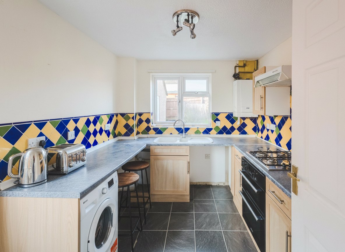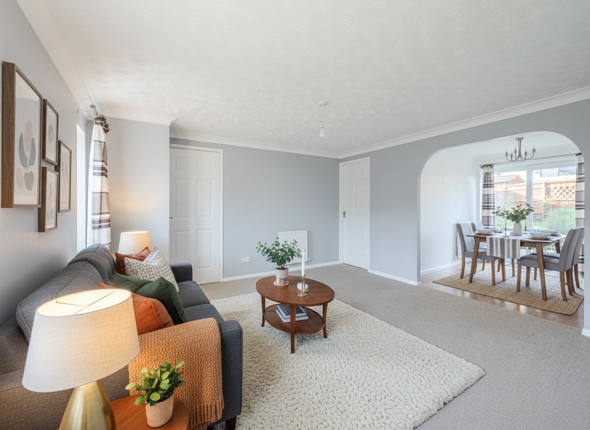 The ground floor features a spacious lounge with a front aspect window and gas fire, flowing openly into a dining room with patio doors that lead directly out to the garden. The kitchen overlooks the rear garden and includes space for essential appliances as well as access to the side of the property. A contemporary cloakroom completes the downstairs accommodation.