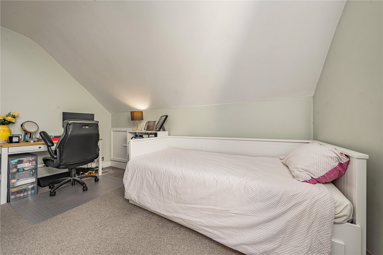 The upper level comprises two spacious double bedrooms, both offering comfortable accommodation with plenty of room for wardrobes and additional storage solutions. The split-level layout provides a practical separation between living and sleeping areas, enhancing the overall sense of space.