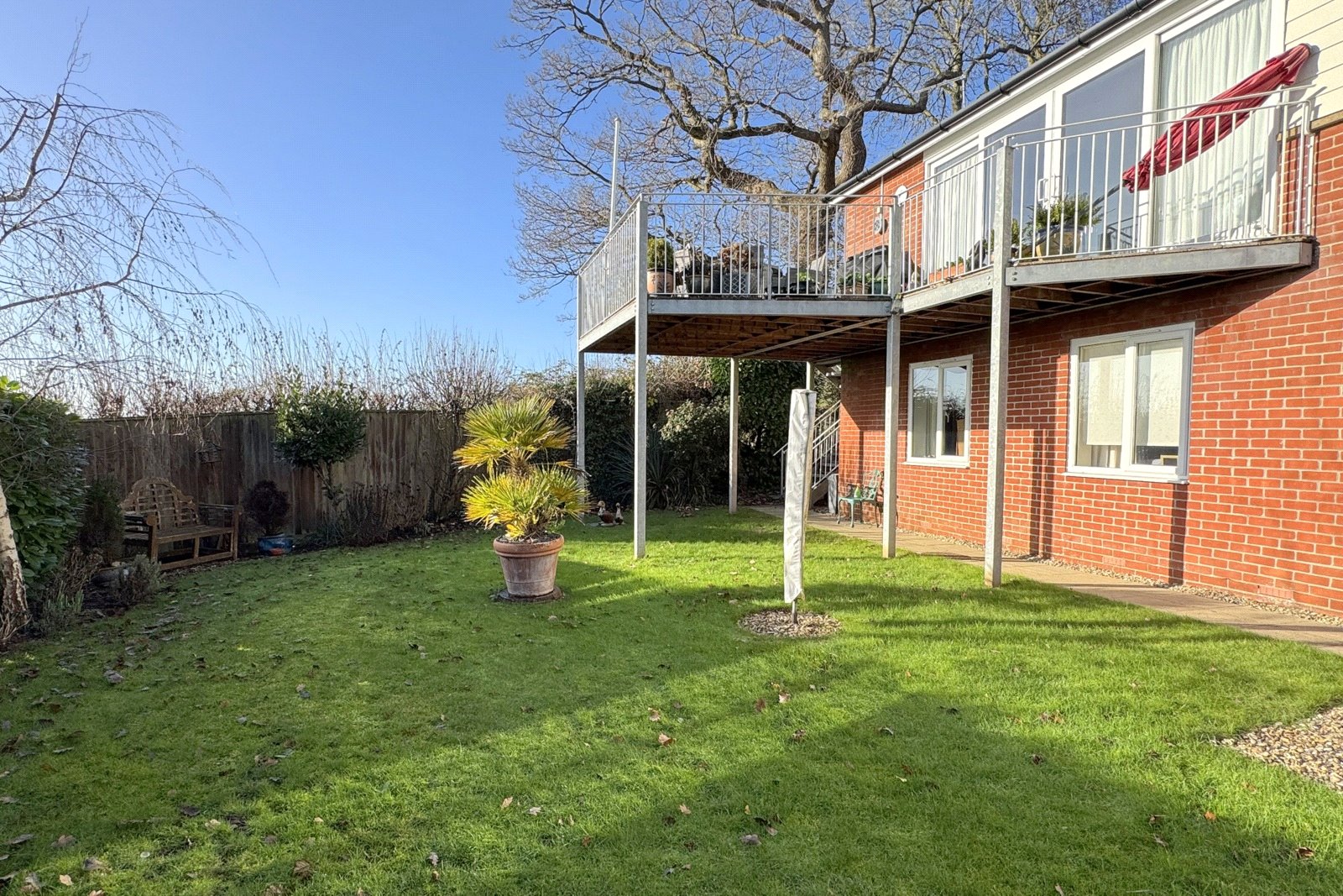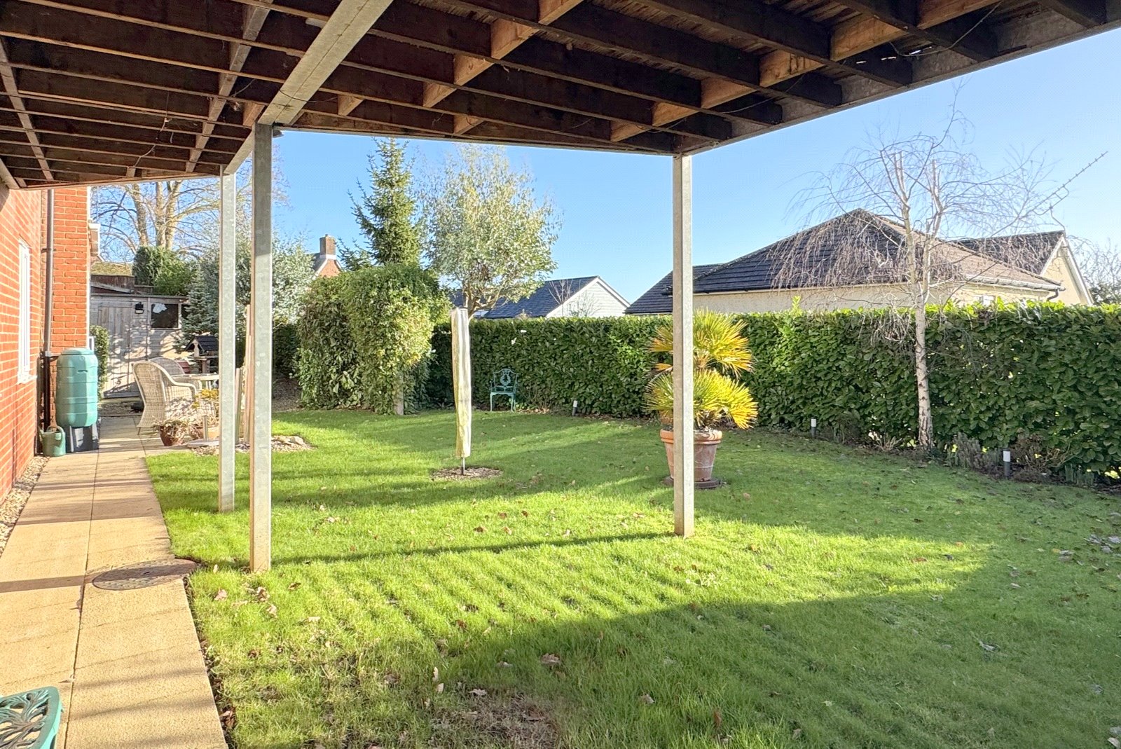 The property is accessed via a gravel driveway providing off-road parking and access to a double garage. To the rear, the garden is primarily laid to lawn and features a paved terrace outside the master bedroom. The garden wraps around both sides of the property, bordered by mature shrubs and plants. A wooden shed offers convenient garden storage, and a side gate provides access to the road. Additionally, the raised terrace off the kitchen creates an ideal space for outdoor dining and relaxation while enjoying the view.
