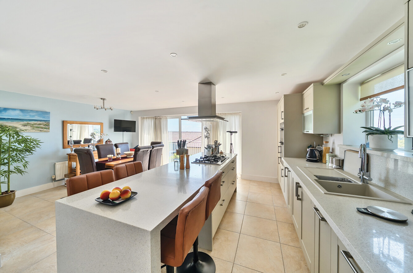 KITCHEN/DINING ROOM: 19’11 (max) x 16’5 (max) This impressive kitchen serves as a stunning focal point of the home, featuring a large granite-topped island with a gas hob, overhead extractor, and generous storage in both cupboards and drawers. Expansive worktops provide ample preparation space, and there's plenty of room for a dining table. Glass doors open directly onto the terrace, creating a seamless connection between indoor and outdoor living. The kitchen also includes integrated appliances such as a double oven, fridge/freezer, and dishwasher, all complemented by a range of wall- and base-mounted units.