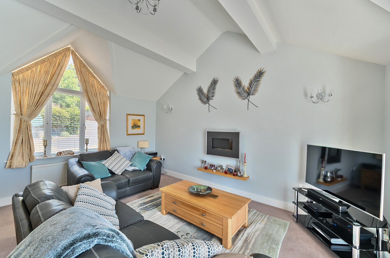 Also on this level is a generously sized dual-aspect living room featuring a wall-mounted gas fire and a door leading to a glass Juliet balcony. There is also a study, which enjoys countryside views through its window.