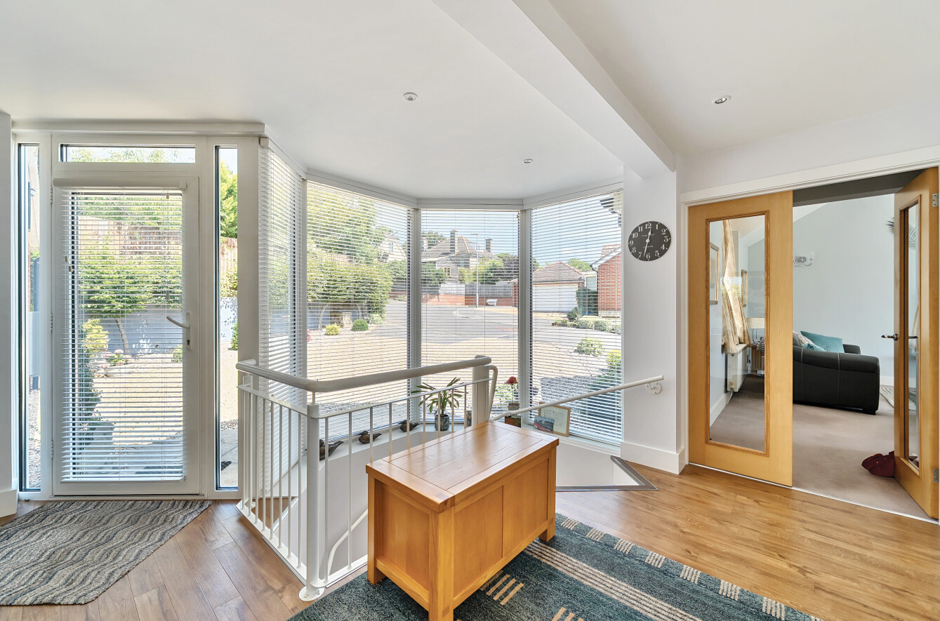 ENTRANCE HALL: Floor to ceiling double glazed windows overlooking the driveway with staircase to sleeping accommodation.