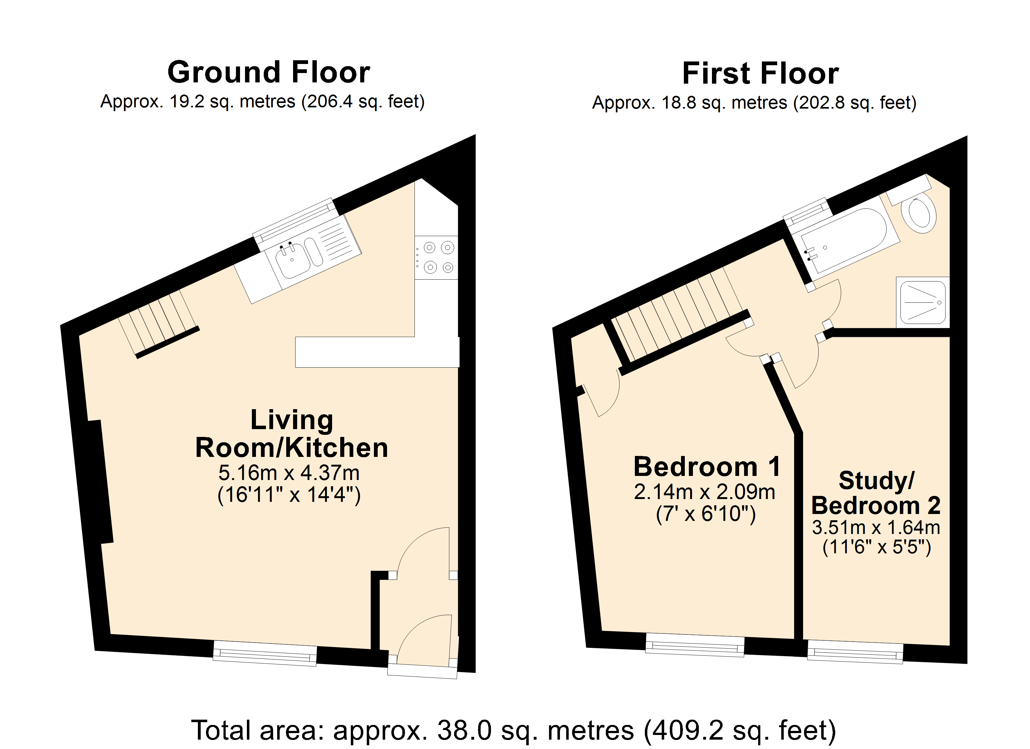 The front door opens to a charming open plan living room/kitchen with an attractive fireplace providing a warm and cosy ambience. Although open plan, the kitchen has its own area featuring exposed brickwork and a breakfast bar.
