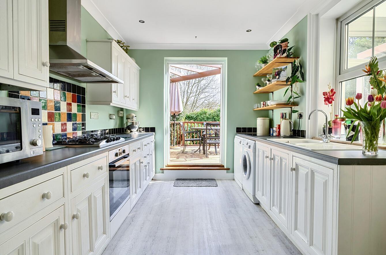 Kitchen: - 13'8" x 8'10" (4.16m x 2.69m) Range of fitted units, electric oven, gas hob with extractor hood over, space and plumbing for further appliances, double doors to outside.