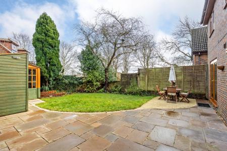 Externally, the property has ample driveway parking to the front and access to the rear garden. The garden is walled on one side and has a generous flagstone patio immediately behind the house, beside a shaped lawn. Mature shrub borders edge the garden whilst there are two generous storage sheds.