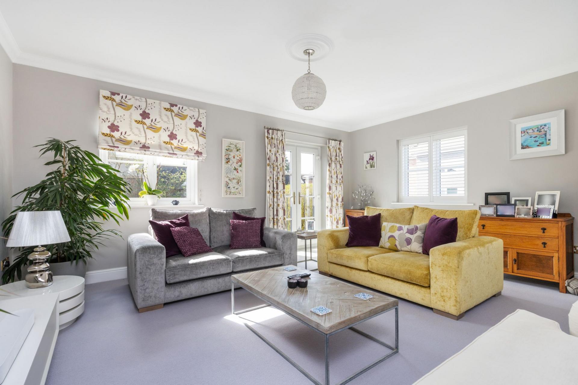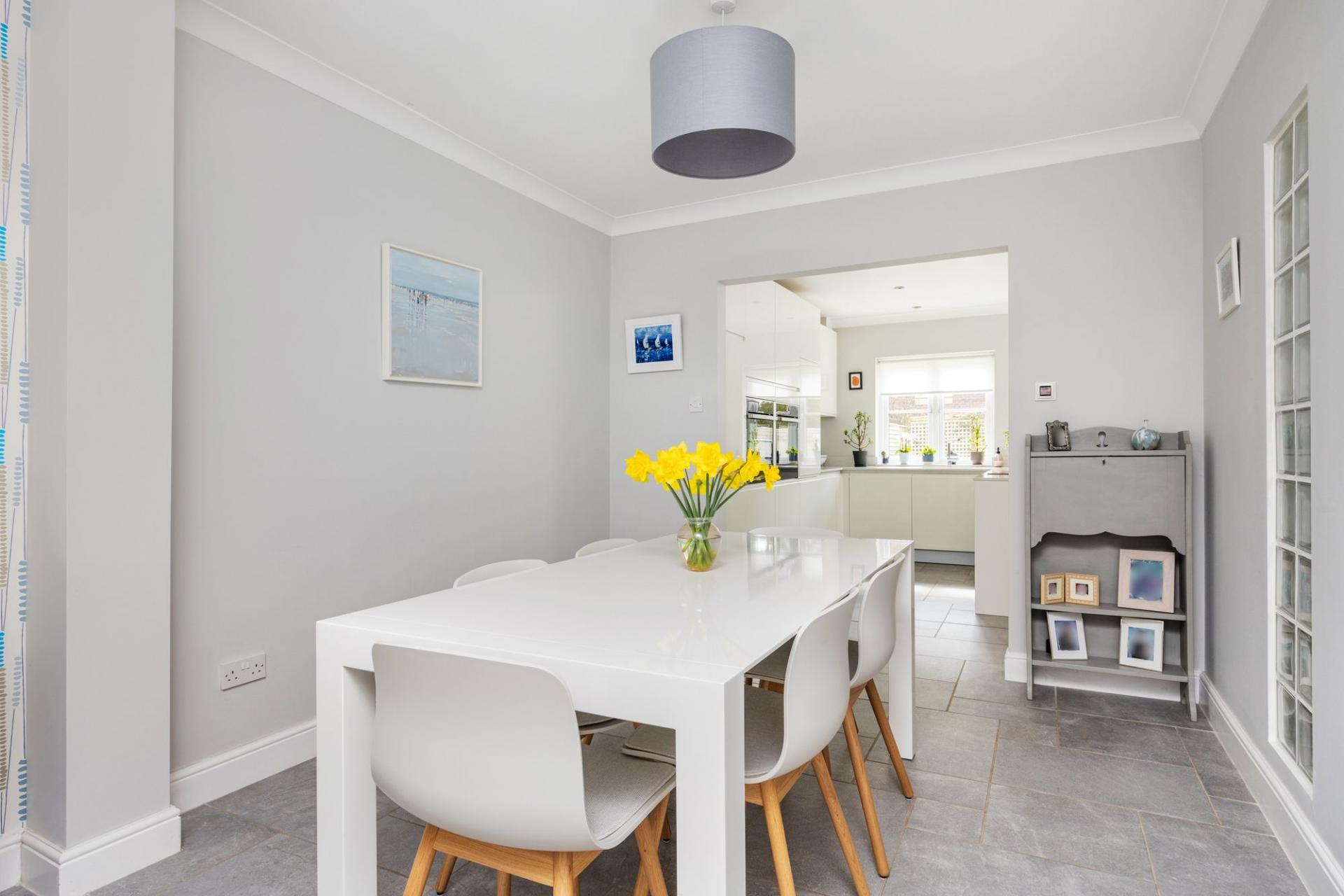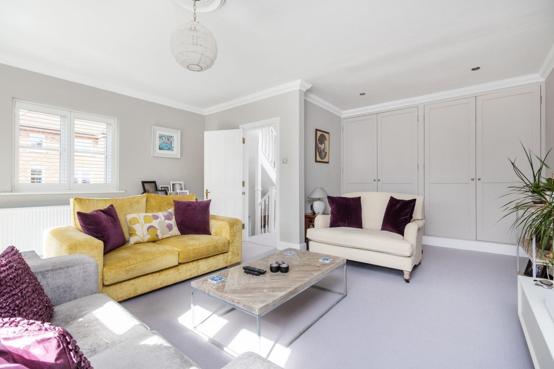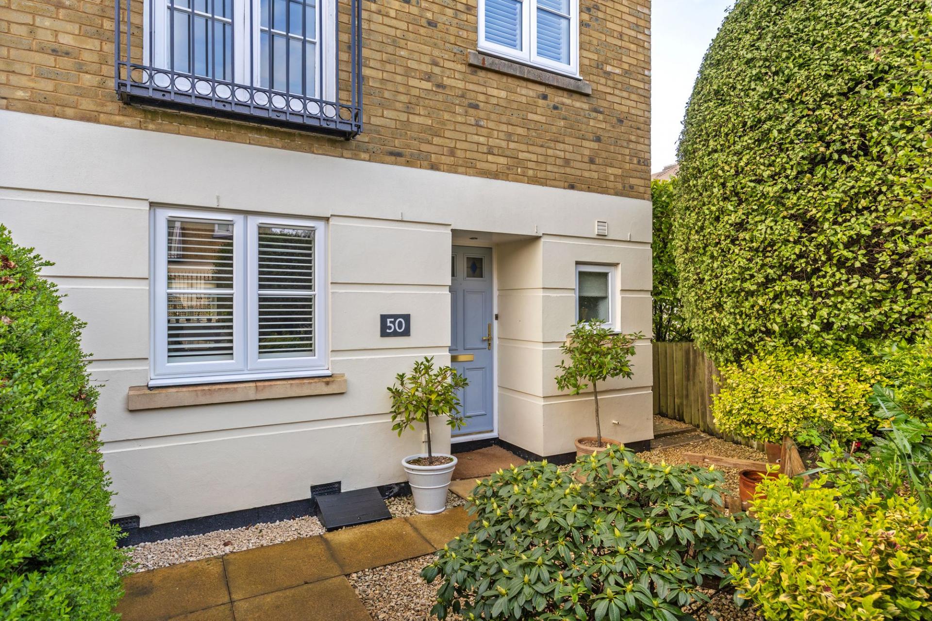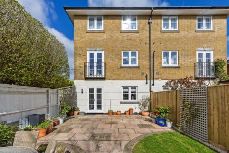 This beautifully presented semi-detached townhouse provides an excellent floor plan over three floors. The ground floor has a welcoming entrance hall with a cloakroom and stairs that rise to the upper floors. To the back of the house is a Kitchen/Breakfast Room re-fitted with a range of sleek white high gloss kitchen with slimline quartz countertops, twin ovens, induction hob, fridge, freezer and dishwasher and a peninsular unit with a breakfast bar. There is a window to the rear garden and French doors that open into the garden. The kitchen has a further range of units with an under-counter wine fridge. This space opens to the sitting/dining room, with a window to the front aspect. The first floor has a drawing room which is a spacious dual aspect room, with a Juliet balcony to the rear aspect. There is also a wall of bespoke fitted cupboards providing excellent storage. A double bedroom with adjacent cloakroom completes this floor. A turning staircase rises to the second floor with a side aspect window providing excellent natural light. There are three bedrooms: the principal having a refitted ensuite shower room, two further bedrooms are served by a family bathroom. The well screened front garden has a path to the front door. There is a south facing rear garden which is largely terraced for ease of maintenance with a small lawn, shrub borders, and a garden store. Gated access opens to two demised parking spaces.
