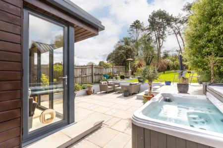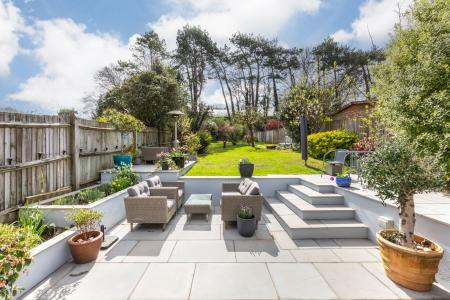 Outside, to the front is a generous driveway which approaches the single garage. The rear garden faces due south is mostly laid to lawn with mature shrubs and fruit trees, an array of well stocked flower borders. A large, landscaped patio terraced is laid in porcelain and provides ample space for dining and entertaining.
