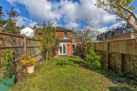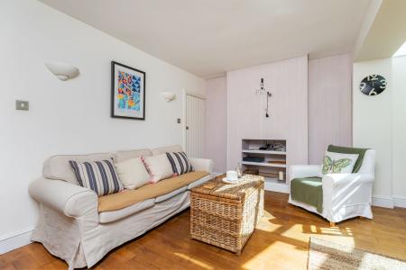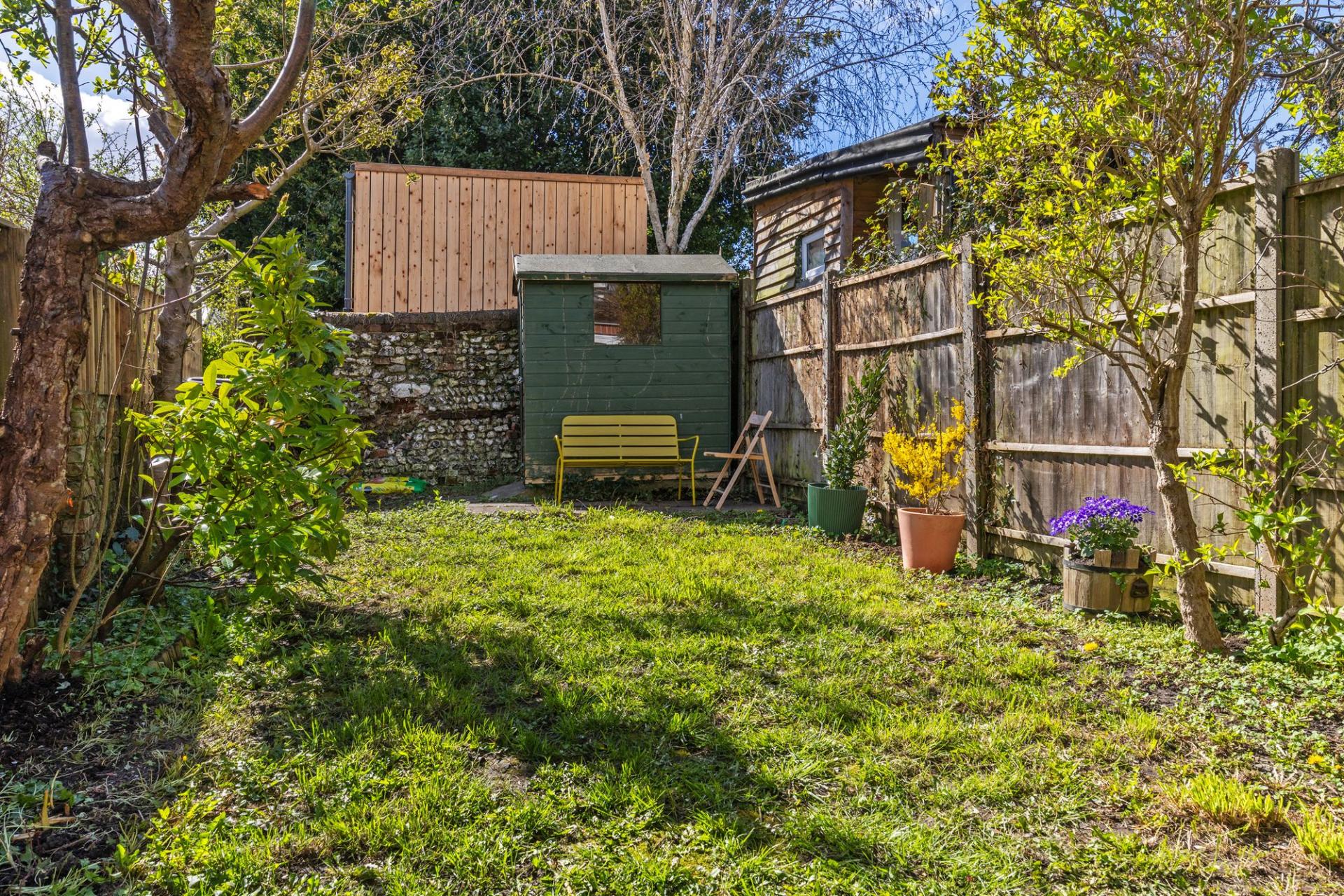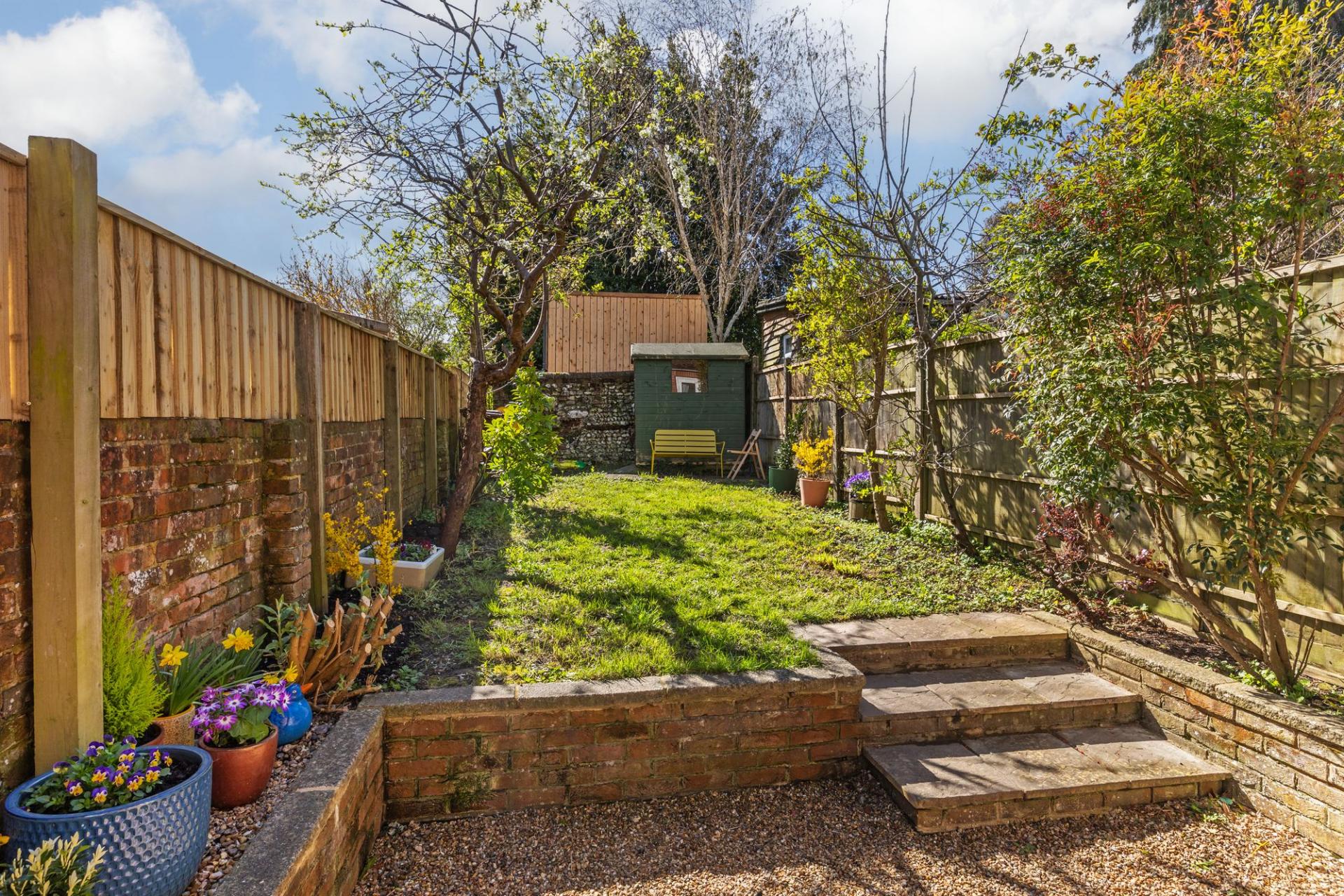 Stairs rise to the two generous double bedrooms, the principal of which is served by an ensuite bathroom. Beautiful sash windows allow for plenty of natural light throughout, adding to the sense of space. On the lower ground floor is the basement with a window to the front. Its most recent use has been for storage but could be converted to create another reception space or bedroom if required, providing scope to add further value. Outside, the property enjoys a private south-facing garden of a surprising size for a house this central, with a pretty flint wall surrounding. The garden is laid to lawn with a shed to the rear and there is space for home office should one need. Residents are able to apply for on-street parking.