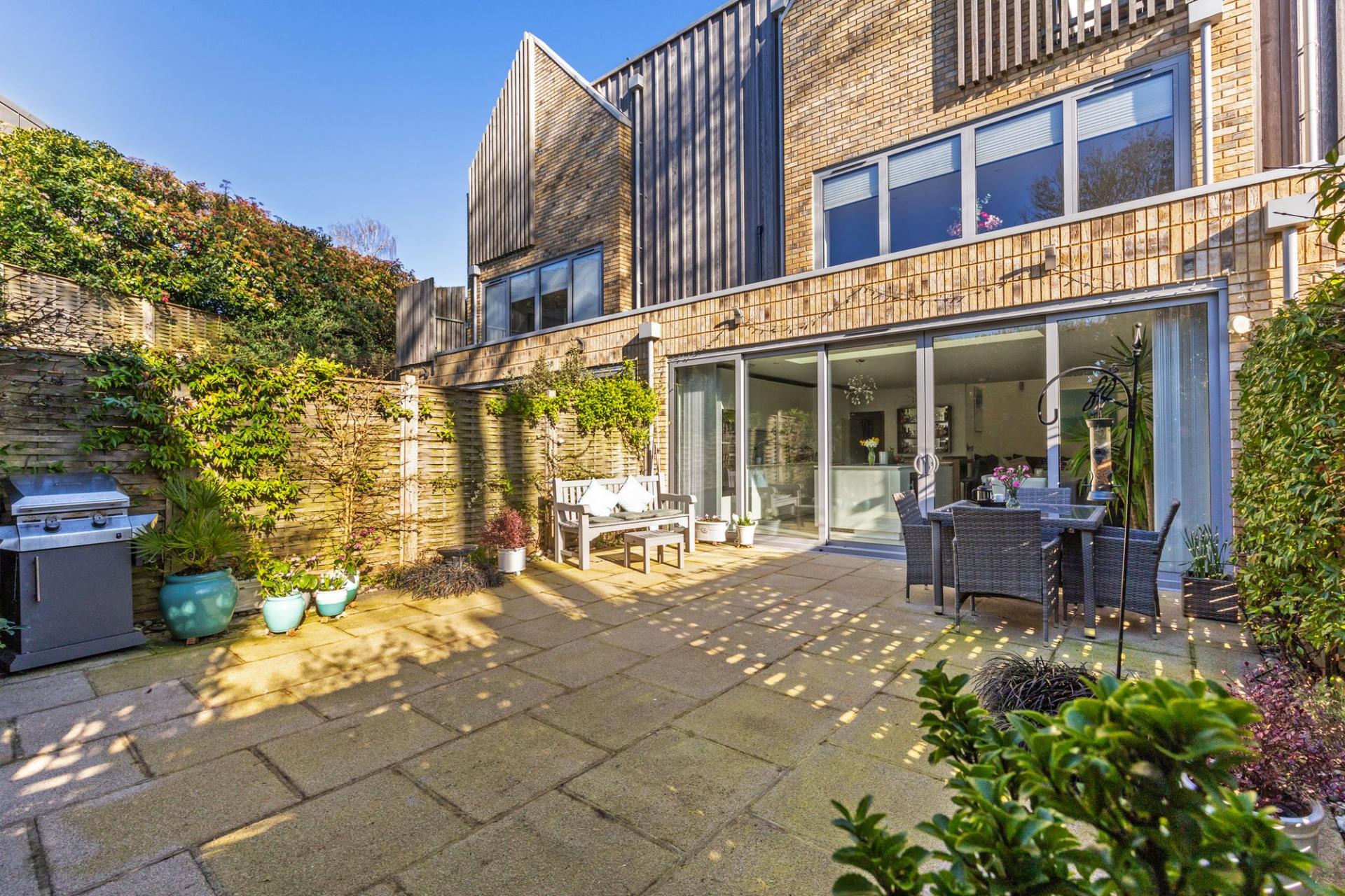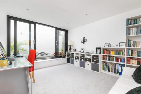 The first floor has a drawing room with a window overlooking the rear garden as well as glass into the atrium allowing borrowed light, there is also a fitted air conditioning unit. The principal bedroom is front aspect and has a walk-in wardrobe and ensuite bathroom. There is a separate guest cloakroom. The second floor has two excellent double bedrooms, the larger is front aspect with fitted wardrobes, the second having a balcony with lighting, creating a small seating area ideal for a cup of coffee or glass of wine, the glass here provides the light for the atrium.