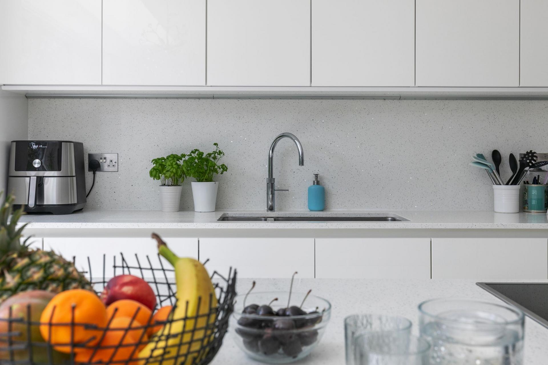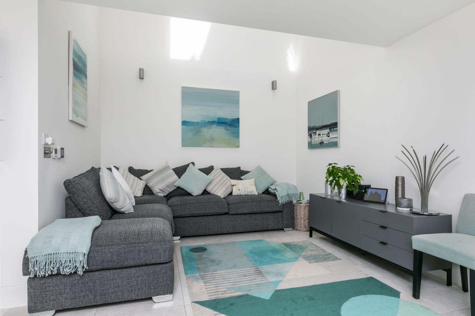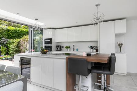 The property is beautifully light and bright due to large grey aluminium windows and doors, as well as an ingenious central glazed atrium which brings light into the ‘live in’ kitchen/sitting/dining room, first floor drawing room as well as the staircase that rises through the centre of the house. A glazed door allows plenty of natural light and opens into the welcoming entrance hall that has a tiled floor and a polished wooden staircase rising to the first floor. Originally designed as a four bedroom house, our vendors specified that the study/bedroom four should be open to the hallway providing an even greater feeling of space, it would however be easy to reinstate a door if desired, this space again has a tiled floor and its own cloakroom. The heart of the house is the large kitchen/sitting/dining room which has been beautifully fitted with an excellent range of crisp white base and eye level units with slimline quartz countertops, twin ‘Miele’ ovens, integrated fridge/freezer and dishwasher. An island unit has an induction hob, undercounter wine fridge and wrap around breakfast bar, the rest of the space allows for a dining table and chairs, with plenty of additional space for a sofa. There is a separate utility room and sliding doors open into the garden.