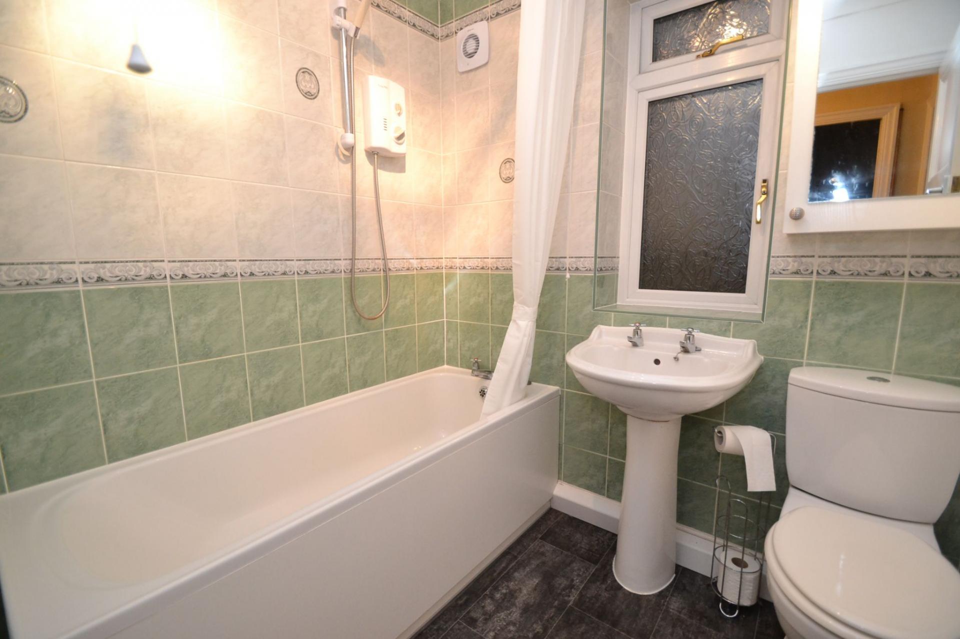 Bathroom: 1.97m x 1.84m (6'4 x 6'0). Three piece suite in white, part tiled, frosted Upvc dg window, shower rail & curtain with an Energy 2000 Gainsborough electric shower over the bath, coving, extractor, radiator, wall cupboards.