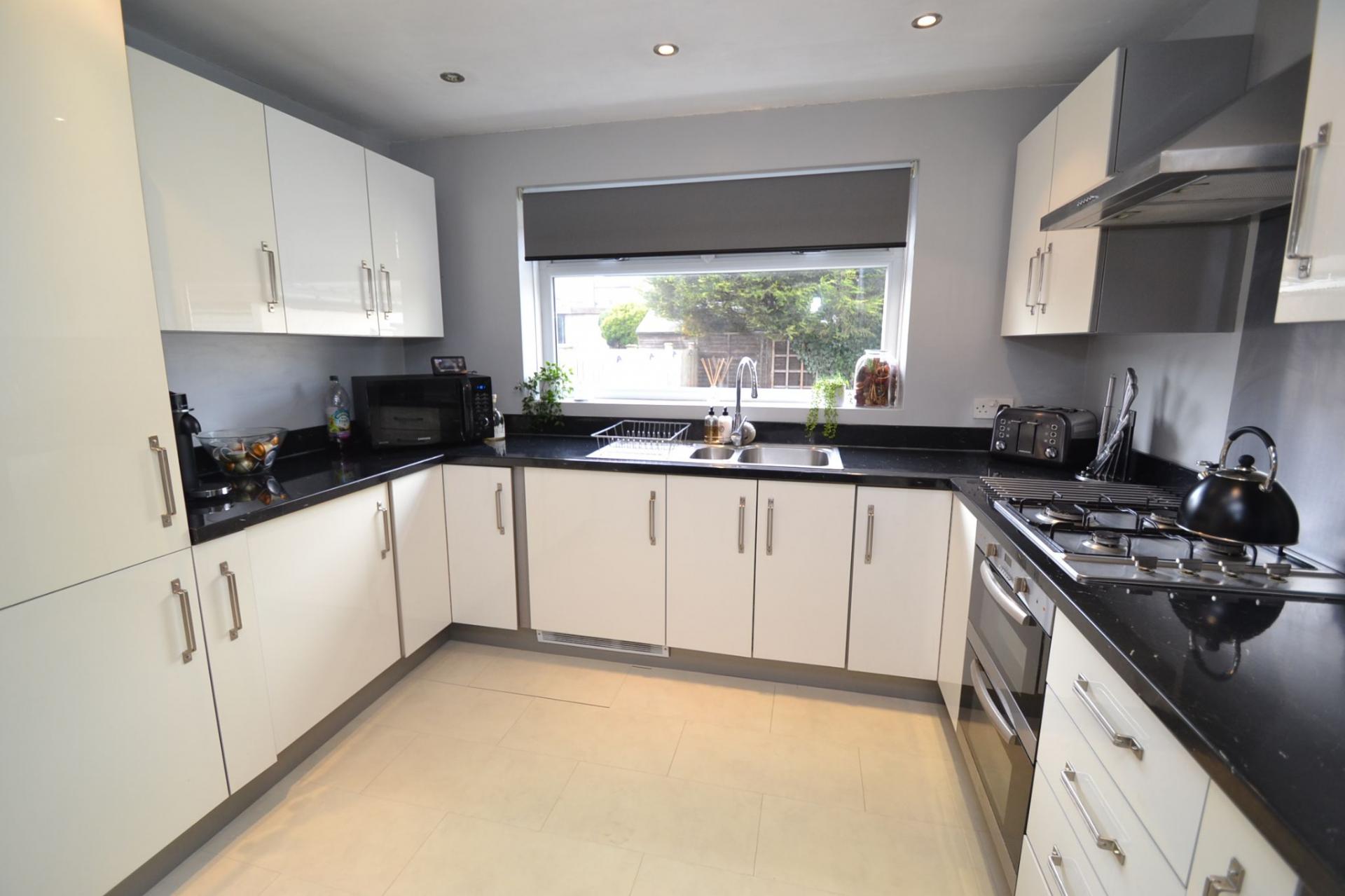 Kitchen: 10'3" x 7'7" (3.12m x 2.31m). Modern white high gloss fitted kitchen having an extensive range of wall and base units, granite effect work tops and matching splash backs, incorporating a stainless steel 1.5 sink unit with a mixer tap, stainless steel double electric oven, 4 ring gas hob and extractor hood all in stainless steel along with a stainless steel splash back, integrated fridge & freezer, integrated auto washer, inset chrome ceiling lights, rear Upvc dg window.