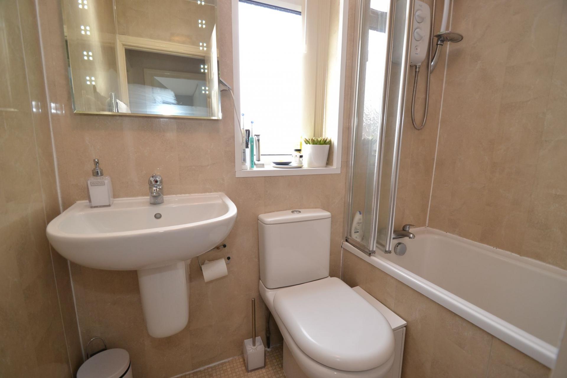 Bathroom: Modern three piece suite in white with an electric shower over the bath and a fold back shower screen, chrome heated towel rail, frosted Upvc dg window, cladded with tiling effect to the walls, extractor.